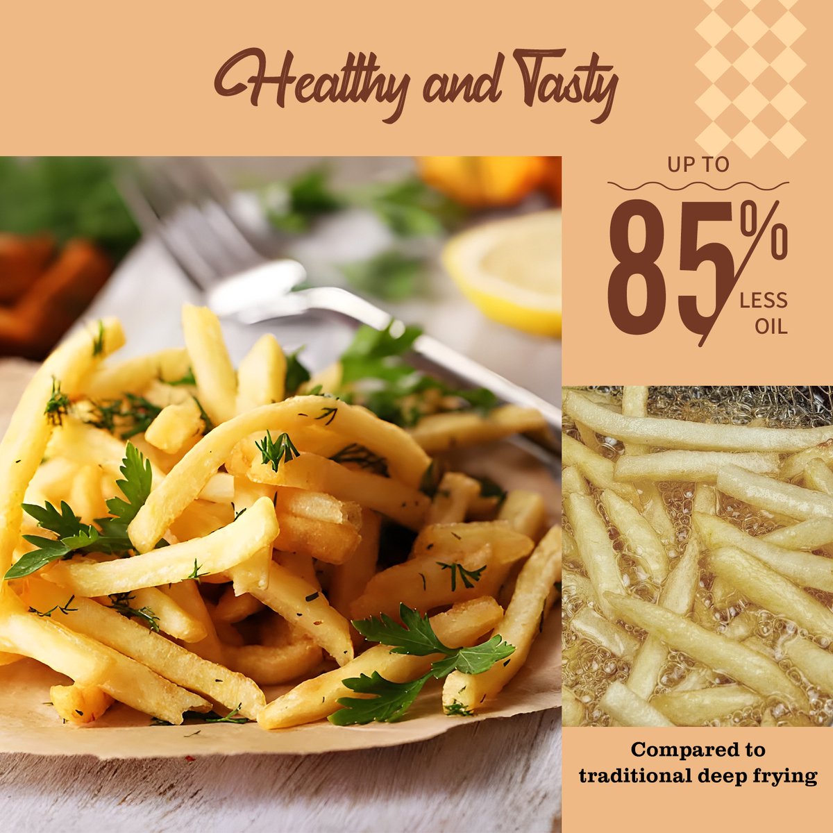 Deze heteluchtfriteuse maakt gebruik van 360° luchtcirculatietechnologie om 20% sneller te koken dan de traditionele friteuse. De temperatuur van de friteuse kan oplopen tot 200°C, waardoor het sap goed in het voedsel kan worden vastgehouden. Deze heteluchtfriteuse gebruikt tot 85% minder olie dan traditionele frituurmethoden, waardoor het een gezondere optie is voor degenen die willen genieten van knapperige texturen zonder de extra calorieën.