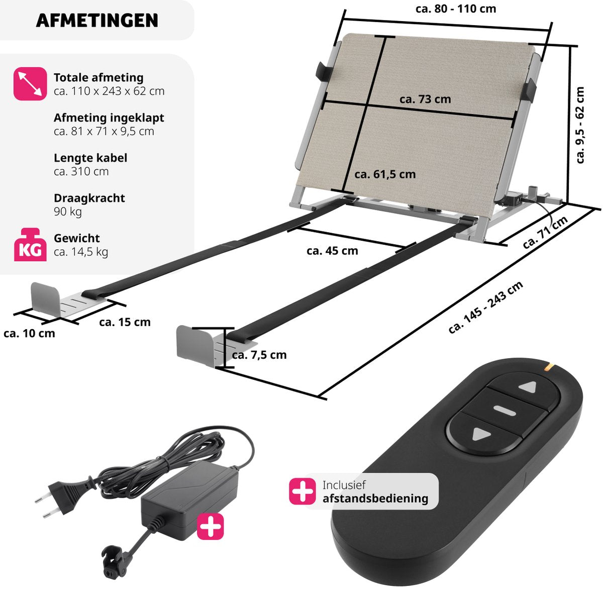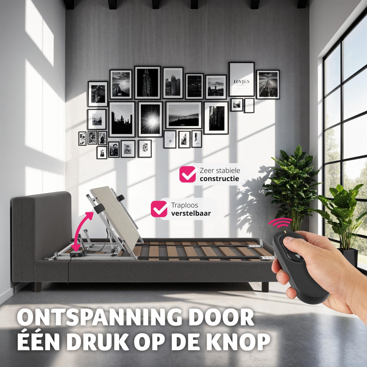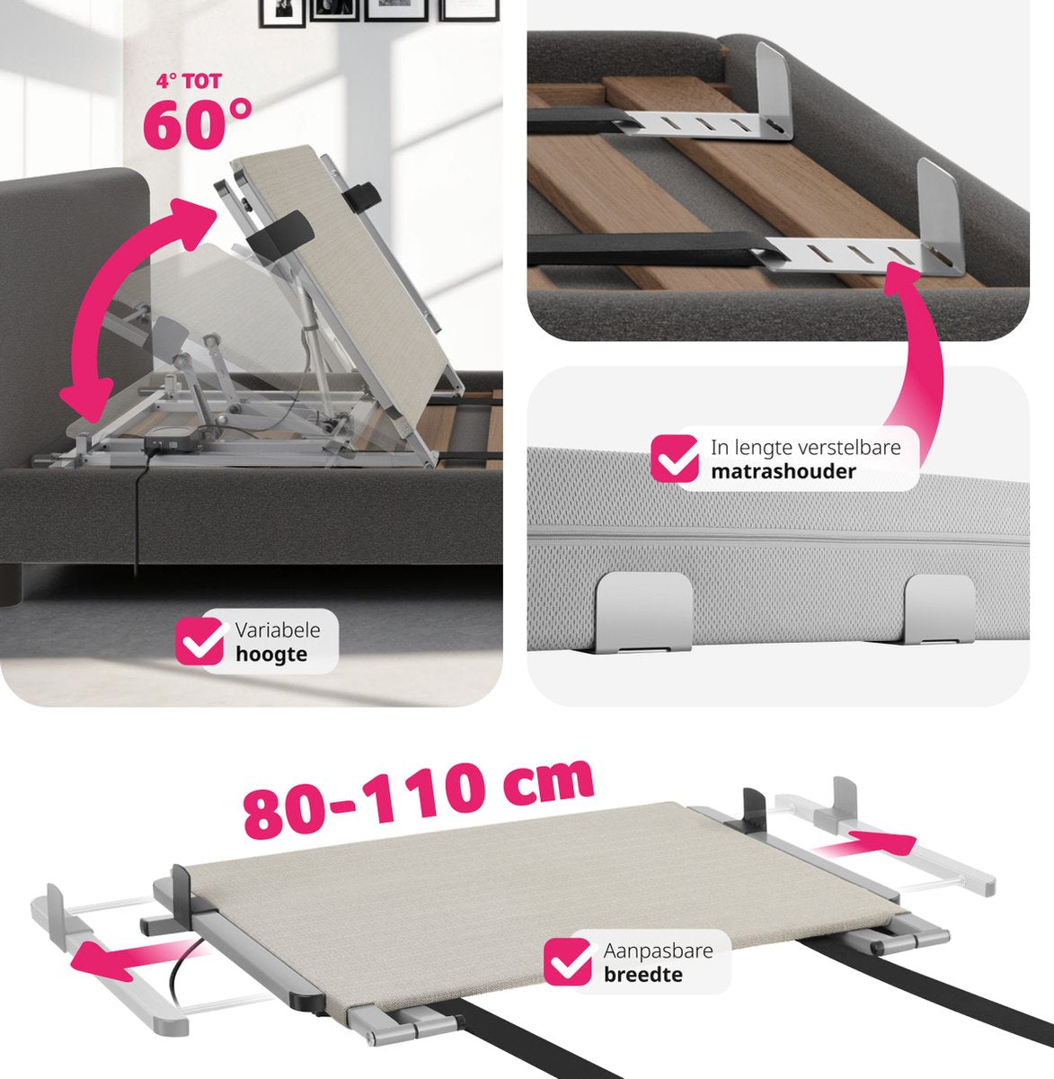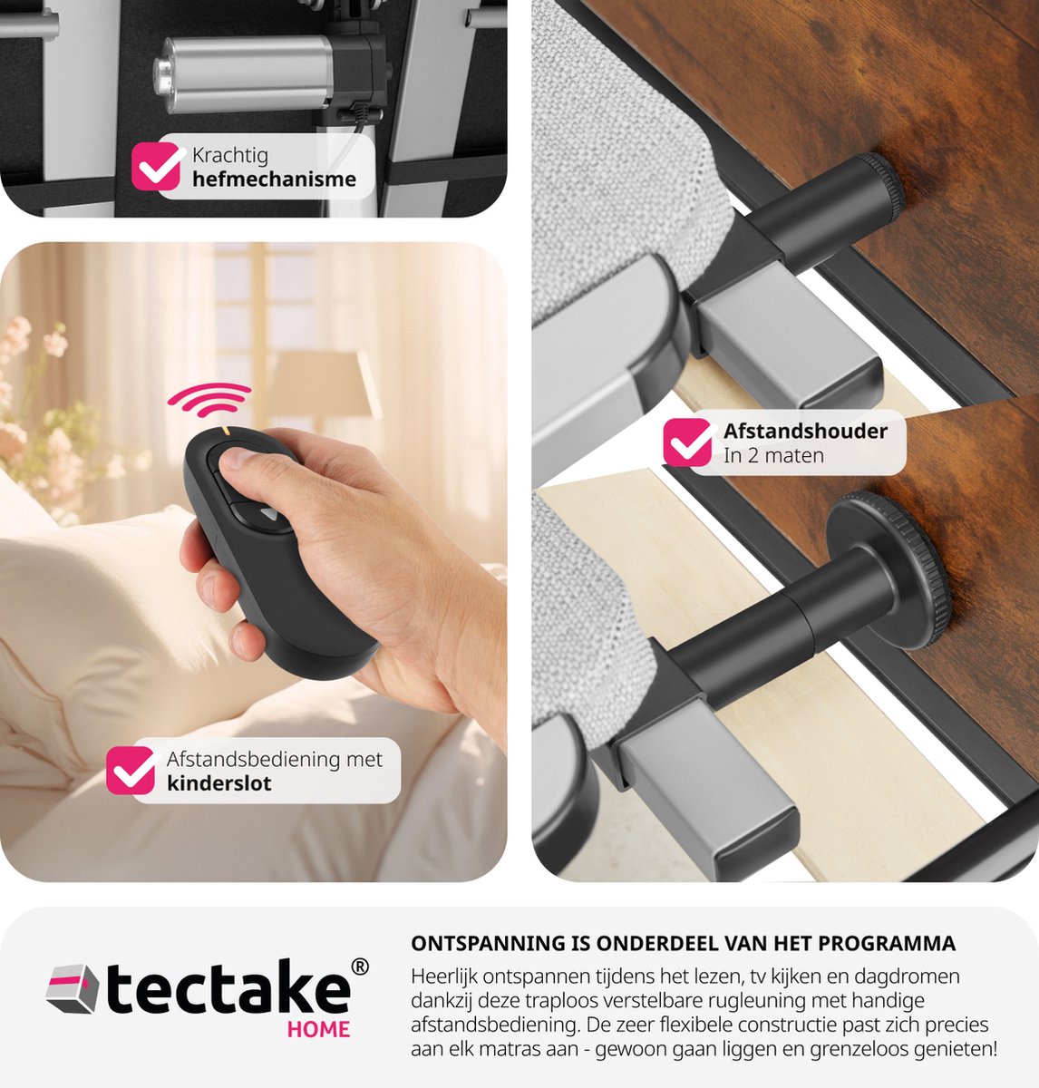 Uitgerust met een stille motor, kan de rugleuning eenvoudig worden versteld met een afstandsbediening. Een bijzonder hoogtepunt is de kinderbeveiligingsfunctie, die voor extra bescherming zorgt. De rugleuning past zich flexibel aan de breedte en lengte van matrassen aan en is door het robuuste stalen frame extreem draagkrachtig. De stabiele hoekplaten fixeren jouw matras betrouwbaar, terwijl afstandshouders in twee maten ervoor zorgen dat jouw muur of het hoofdeinde van het bed beschermd blijven tegen beschadigingen.