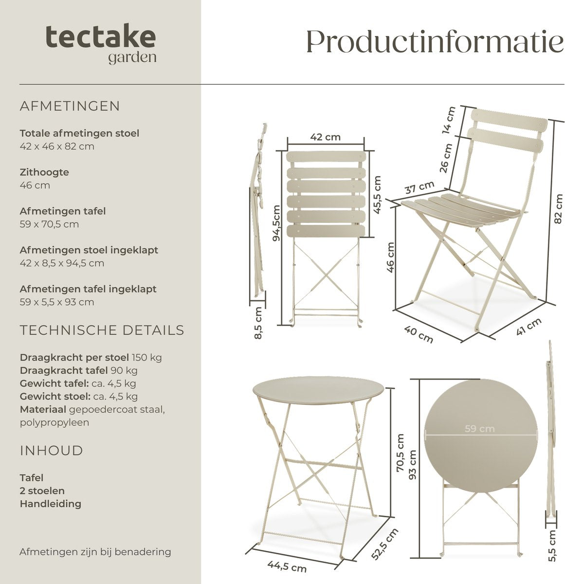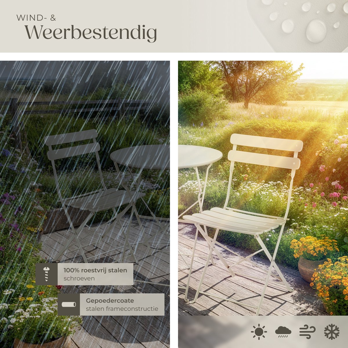 De tuinset valt op door zijn ruimtebesparende klapfunctie, die het mogelijk maakt om de tafel en stoelen eenvoudig op te bergen of te vervoeren wanneer ze niet worden gebruikt. Geen moeizame opbouw is nodig - de set is direct klaar voor gebruik en biedt je maximaal comfort zonder inspanning. De solide frames van gepoedercoat staal zijn extreem draagkrachtig en stabiel, dankzij de vloervriendelijke en antislip voetdoppen.