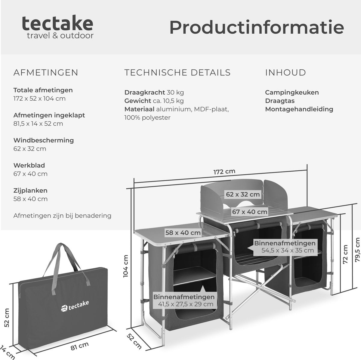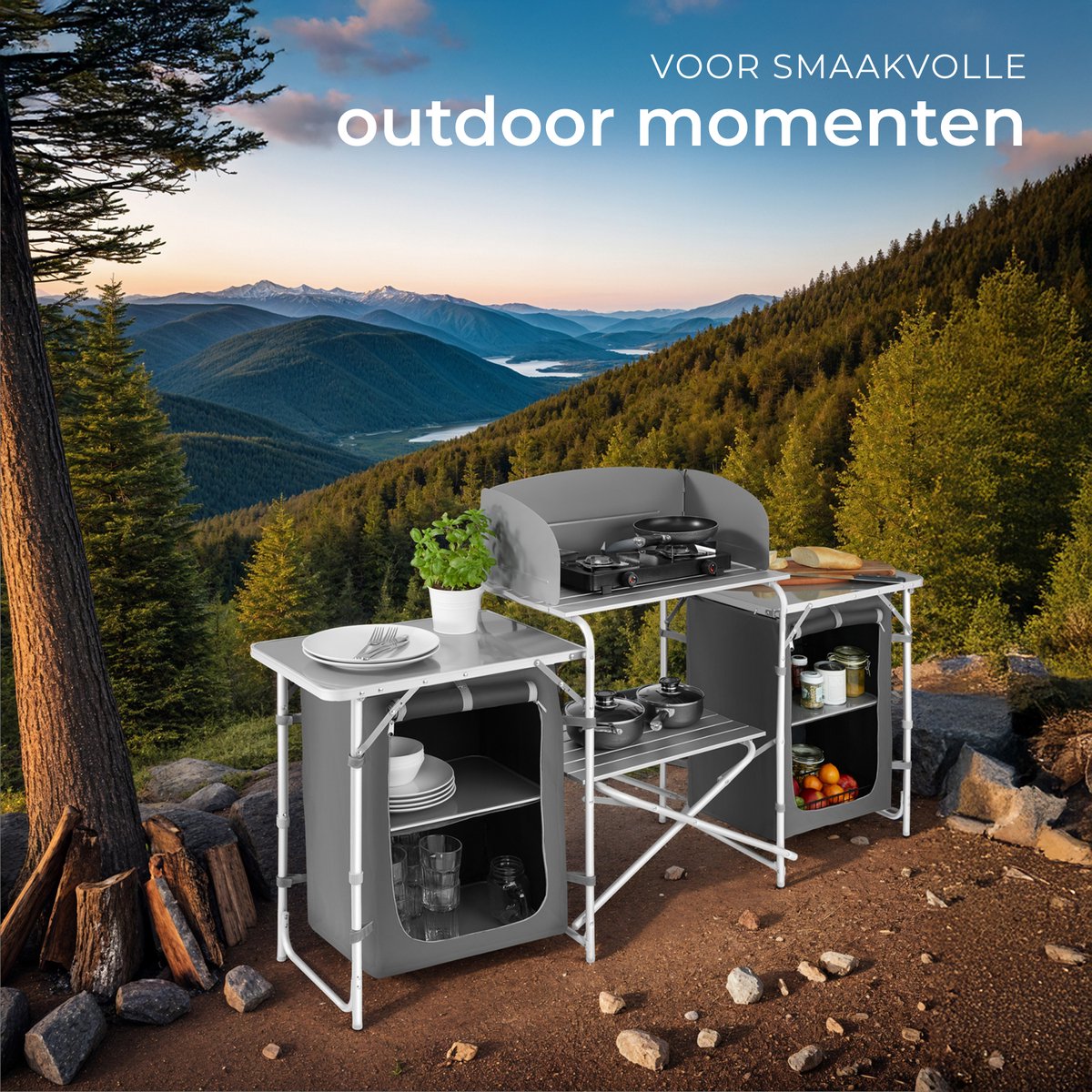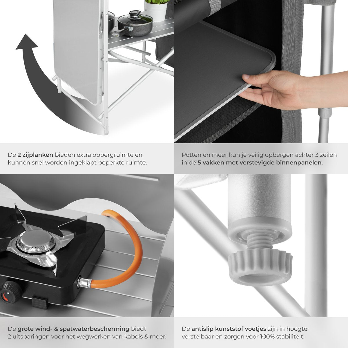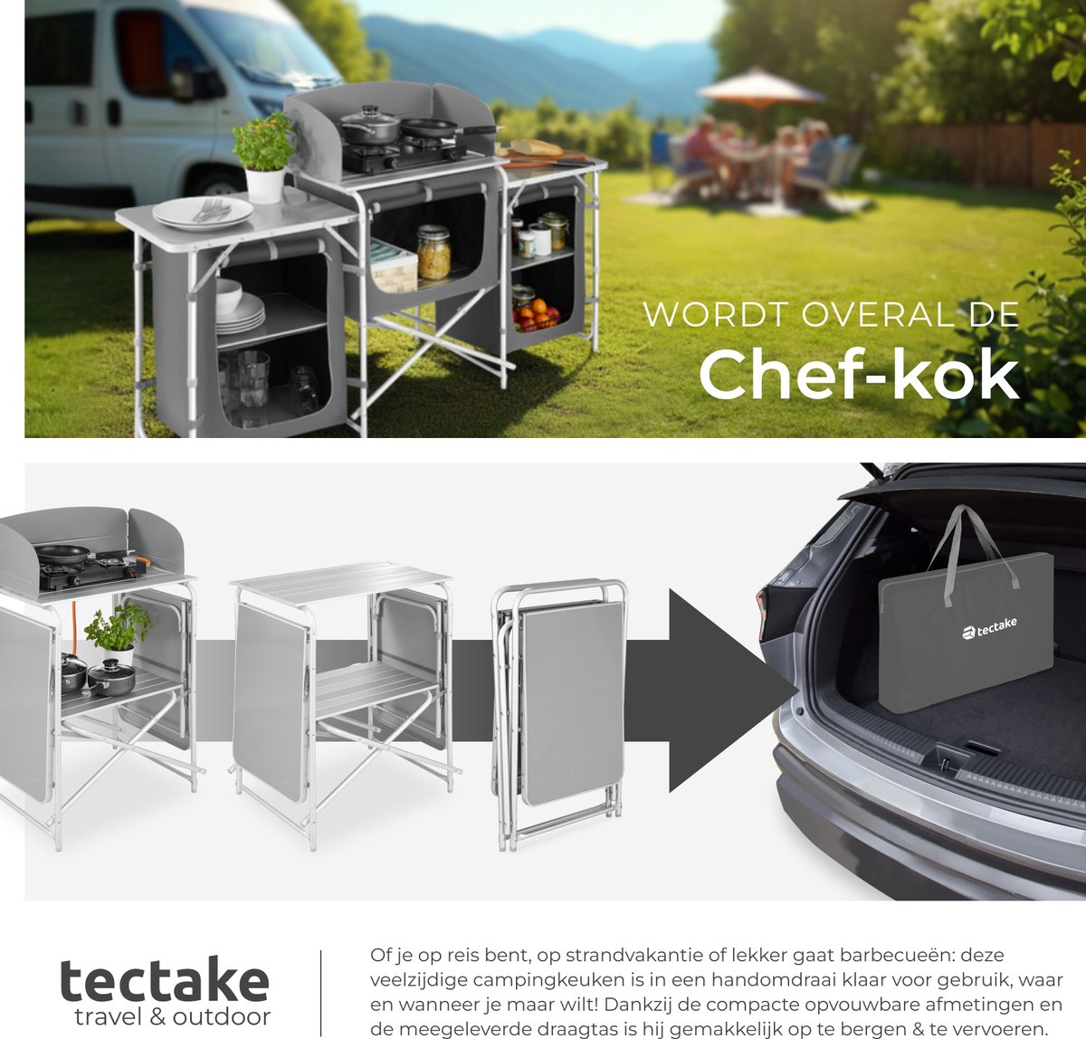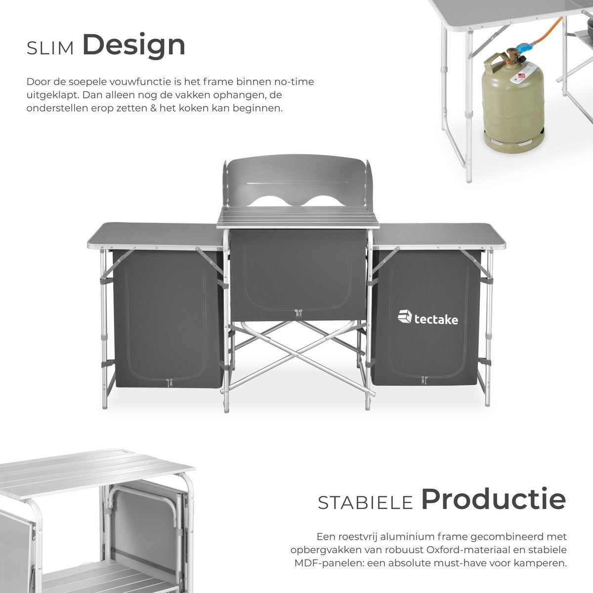 Combineer huiselijke comfort en kampvuurromantiek met de robuuste campingkeuken van TecTake. In enkele minuten is de plooibare outdoor keuken opgebouwd. Oneffenheden zijn dankzij de verstelbare voeten van de flexibele keukentent geen probleem. De hittebestendige werkplaat met praktisch windscherm is geschikt voor een gasvuur. Keukengereedschap hebben voldoende plaats op de zijdelingse legvlakken en in de drie apart sluitbare opbergvakken van de compacte opbouwkeuken. Geniet van lekker eten buiten de eigen vier muren met de campingkeuken van tectake.