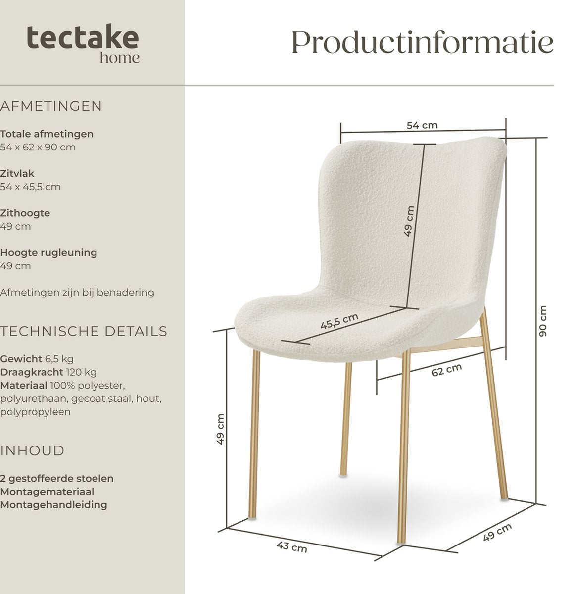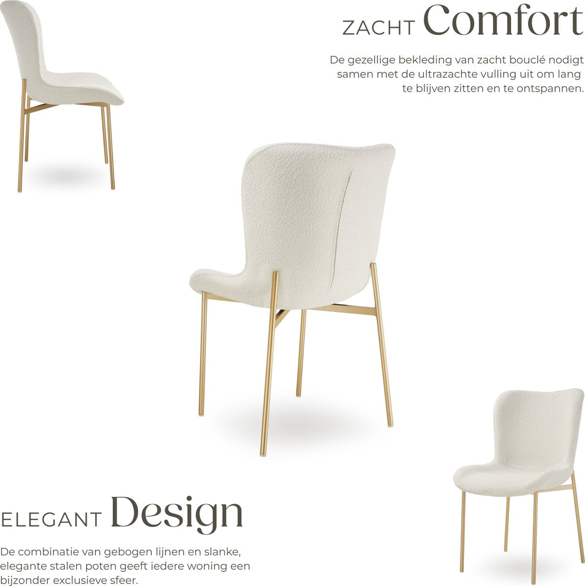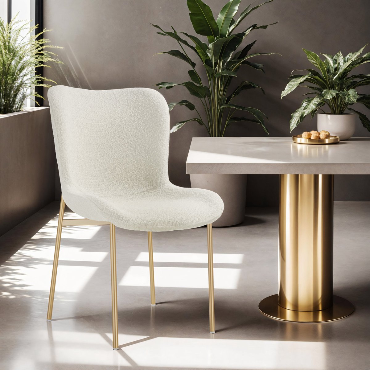 De gestoffeerde stoel Tessa met knusse bouclé-stof is een comfortabele blikvanger voor jouw huis. Deze gestoffeerde premium stoel in Scandi-stijl valt op door zijn combinatie van witte stof en slanke stalen poten in elegant goud, wat een luxe uitstraling creëert.
