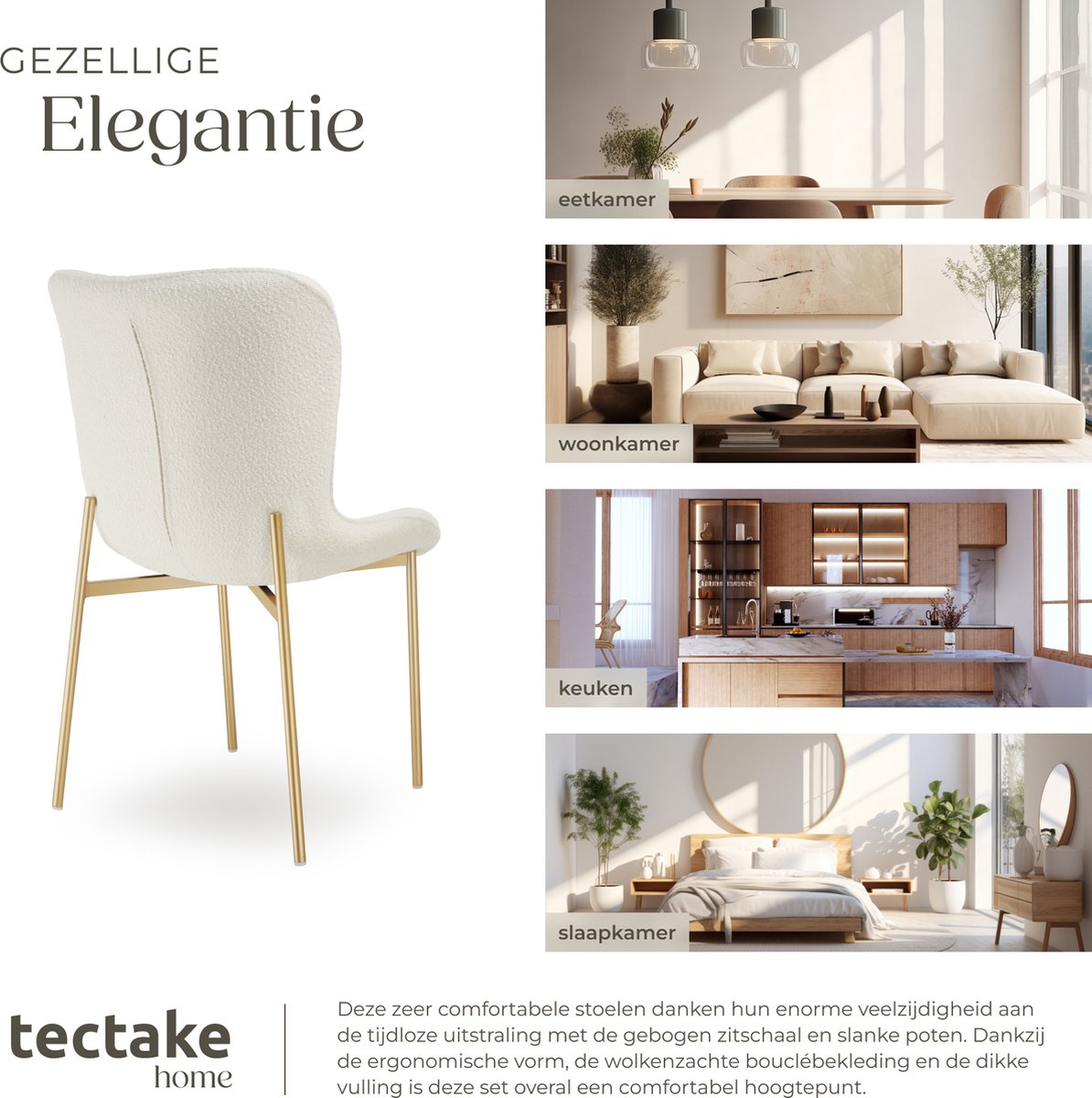 De bouclé-stoel past naadloos in elk interieur en geeft jouw huis een bijzondere touch. Zijn tijdloze ontwerp maakt hem tot een uitstekende keuze voor verschillende woonstijlen, van modern tot klassiek. Met de gestoffeerde stoel Tessa wordt jouw eetkamer gegarandeerd een plek van elegantie en gezelligheid.