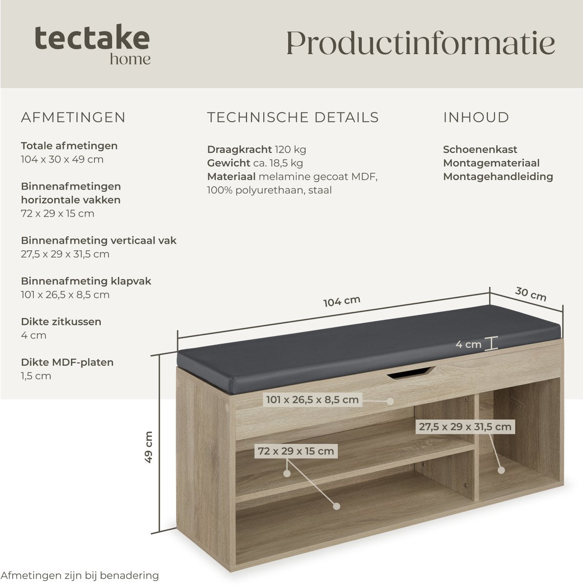 Tuinmeubelen met robuuste en stabiele constructie: de stabiele constructie van de schoenenkast met zitbank zorgt voor een hoge belastbaarheid en stabiliteit. Deze zitkist met opbergruimte is een robuuste aanvulling op een garderobeset en zorgt voor het veilig opbergen van schoenen en andere accessoires.