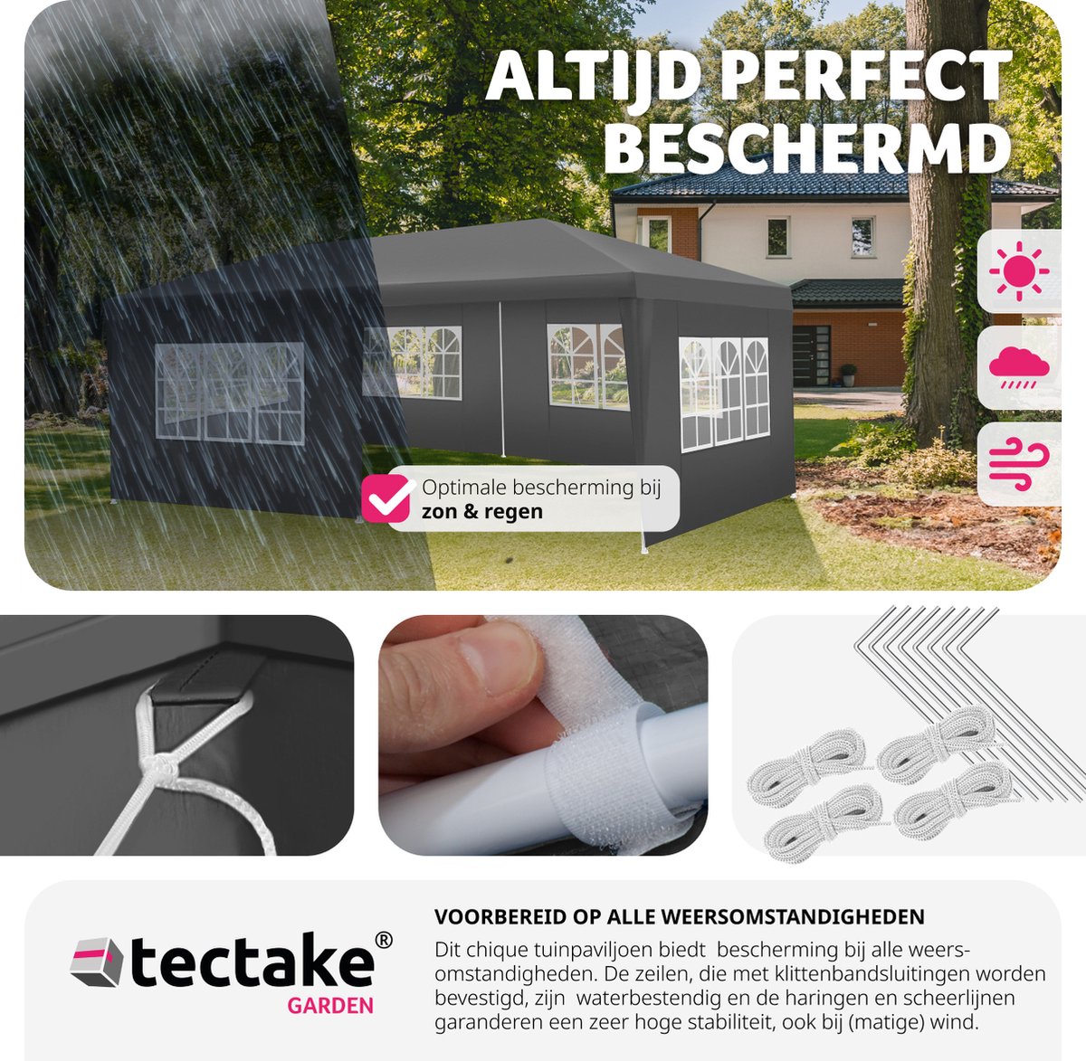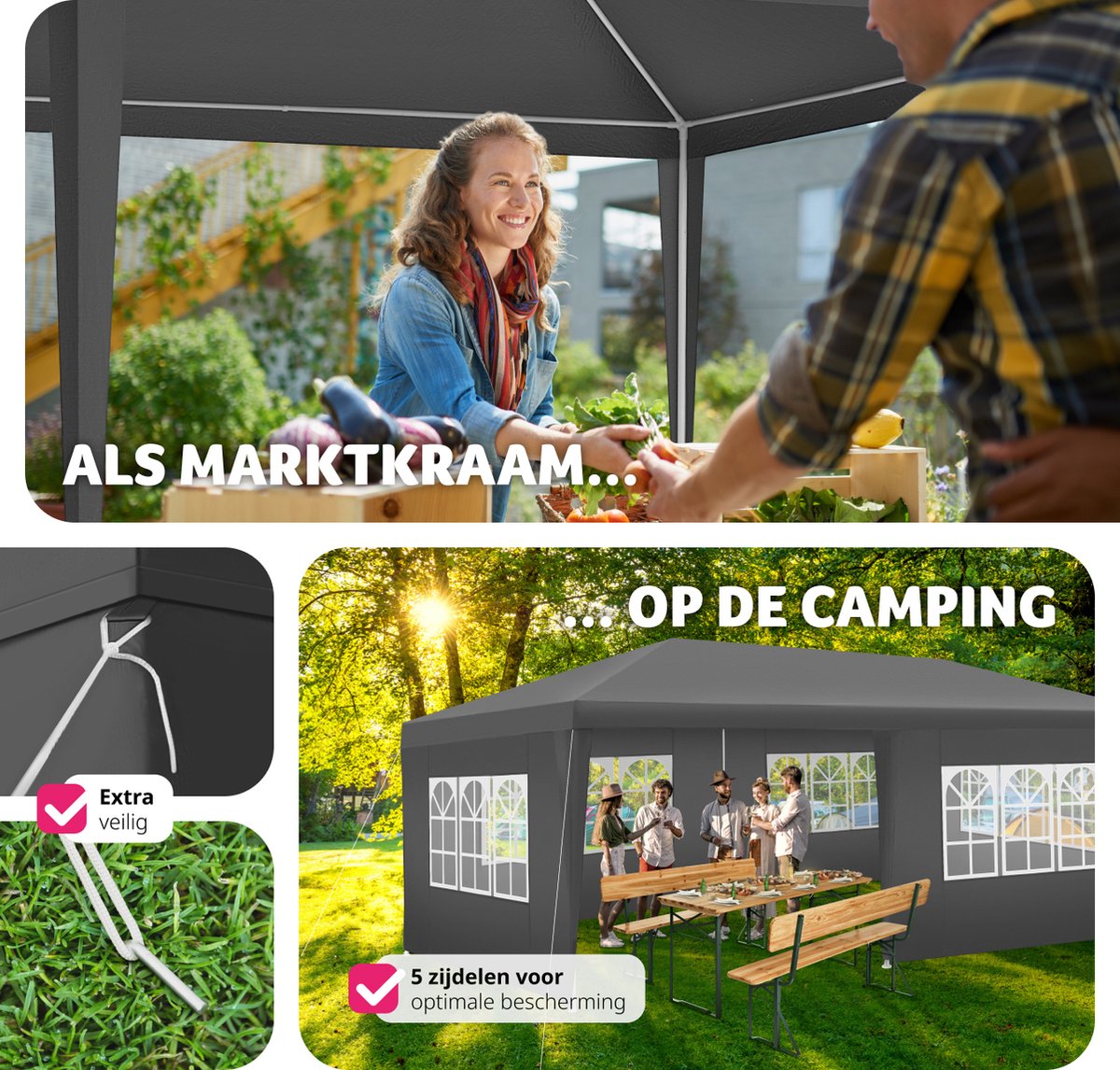 Dankzij de vijf flexibele zijwanden, die bij de levering zijn inbegrepen, kun je de pavilion aanpassen aan je behoeften. Je kunt de wanden openen of sluiten afhankelijk van het weer of je gewenste mate van privacy. De meegeleverde spanriemen en haringen zorgen voor extra stabiliteit en veiligheid, zodat je pavilion zelfs bij winderig weer stevig verankerd blijft.