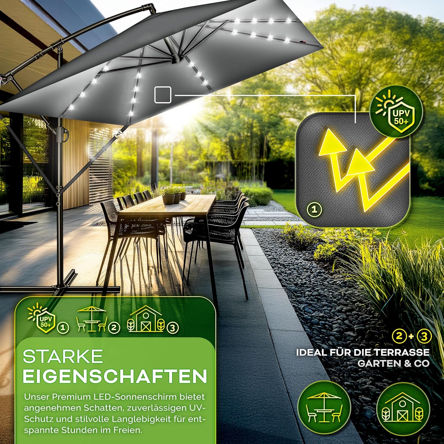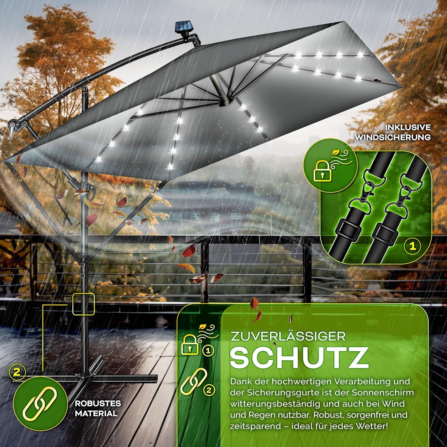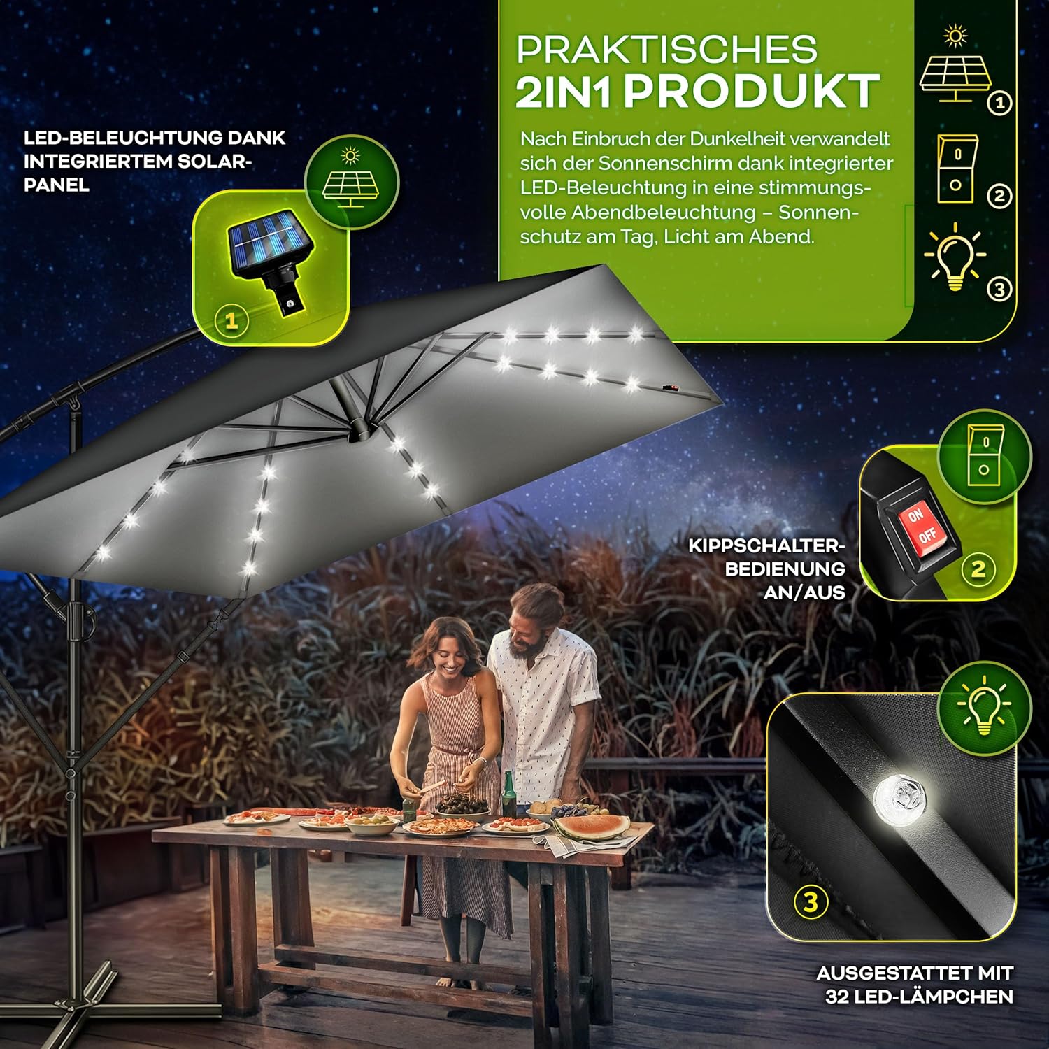 • Sfeervolle verlichting: grote parasol met 32 ledlampen (gezellig warm licht) en Ø 330 cm voor een grote schaduw. Het krachtige zonnepaneel zorgt voor voldoende stroom. De bediening gebeurt door middel van een aan-/uitschakelaar.