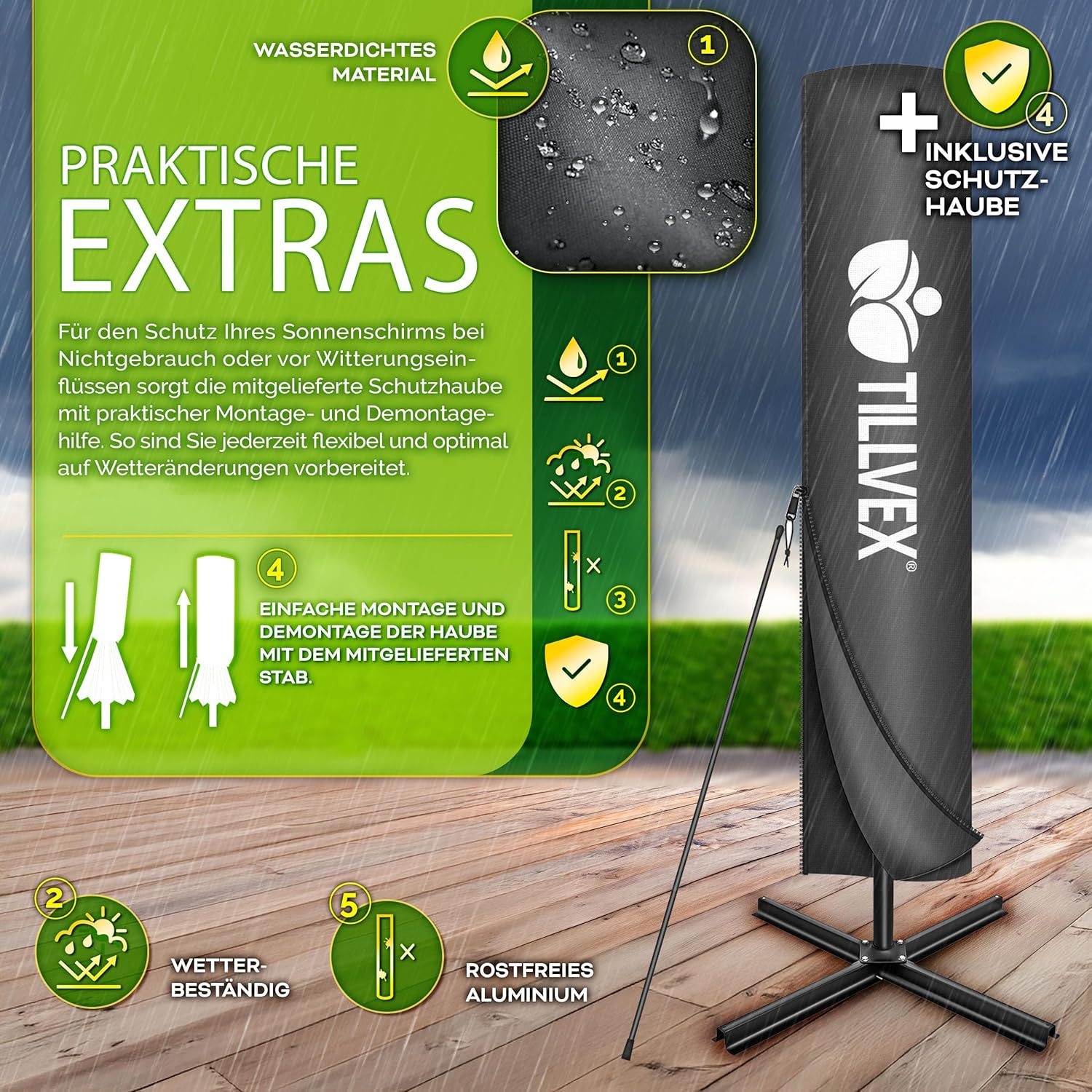 tillvex Aluminium parasol, rechthoekig, diameter 330 cm, + afdekking met zwengel, rechthoekig, met standaard en windbescherming, tuinparasol, uv-bescherming aluminium, zwengelparasol, marktparasol, waterdicht, 360 graden draaibaar