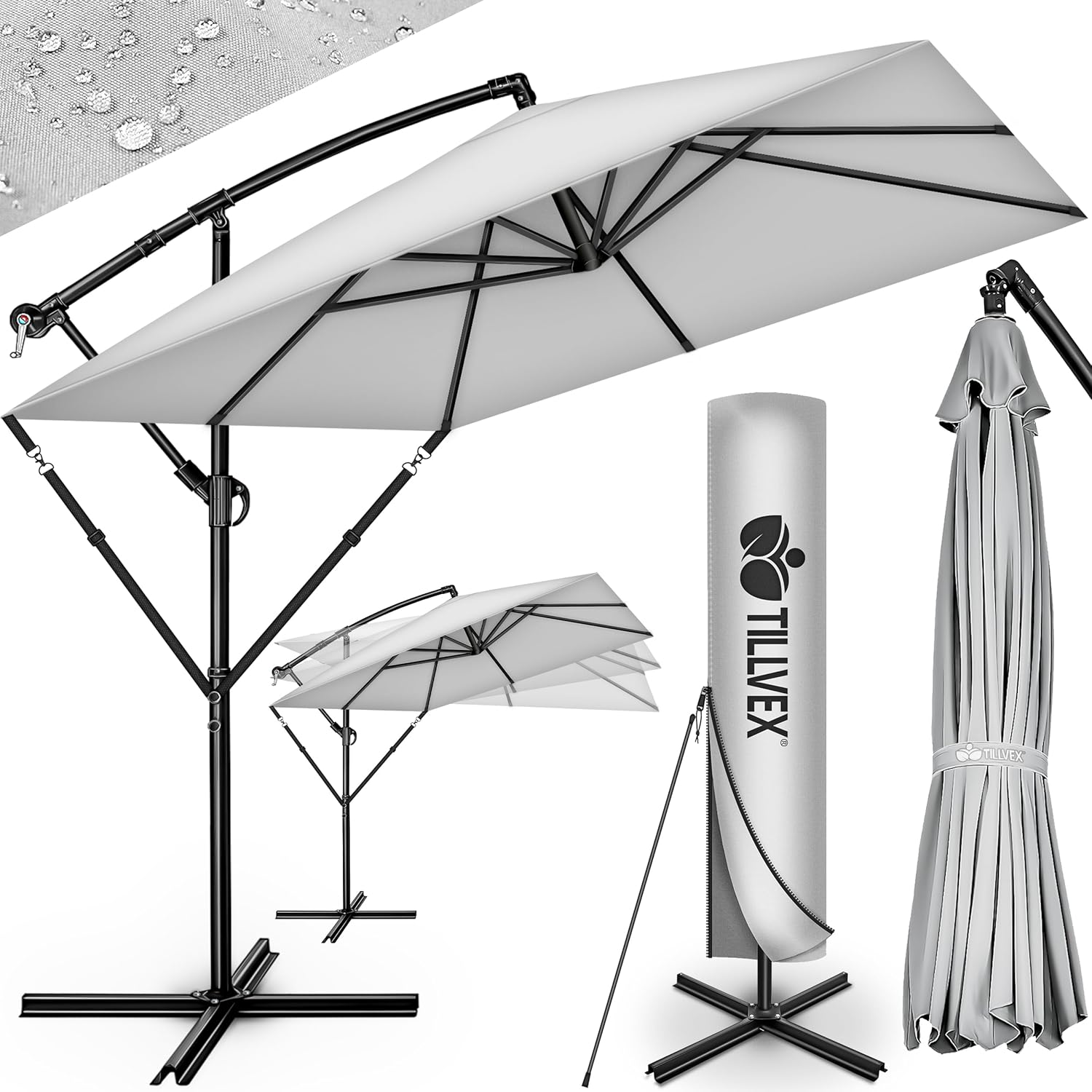 tillvex® Aluminium parasol, rechthoekig, diameter 330 cm, + afdekking met zwengel, rechthoekig, met standaard en windbescherming, tuinparasol, uv-bescherming aluminium, zwengelparasol, marktparasol, grijs