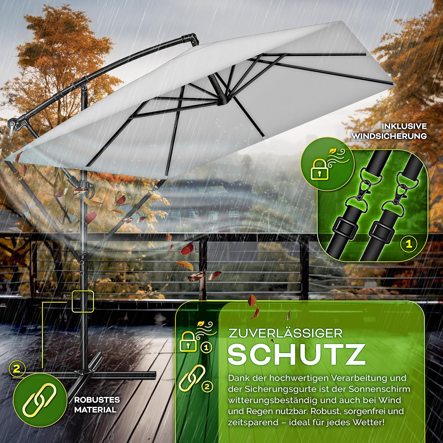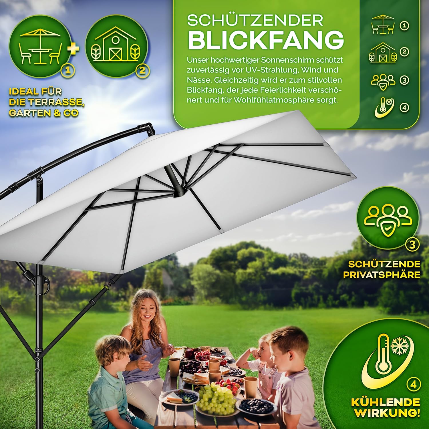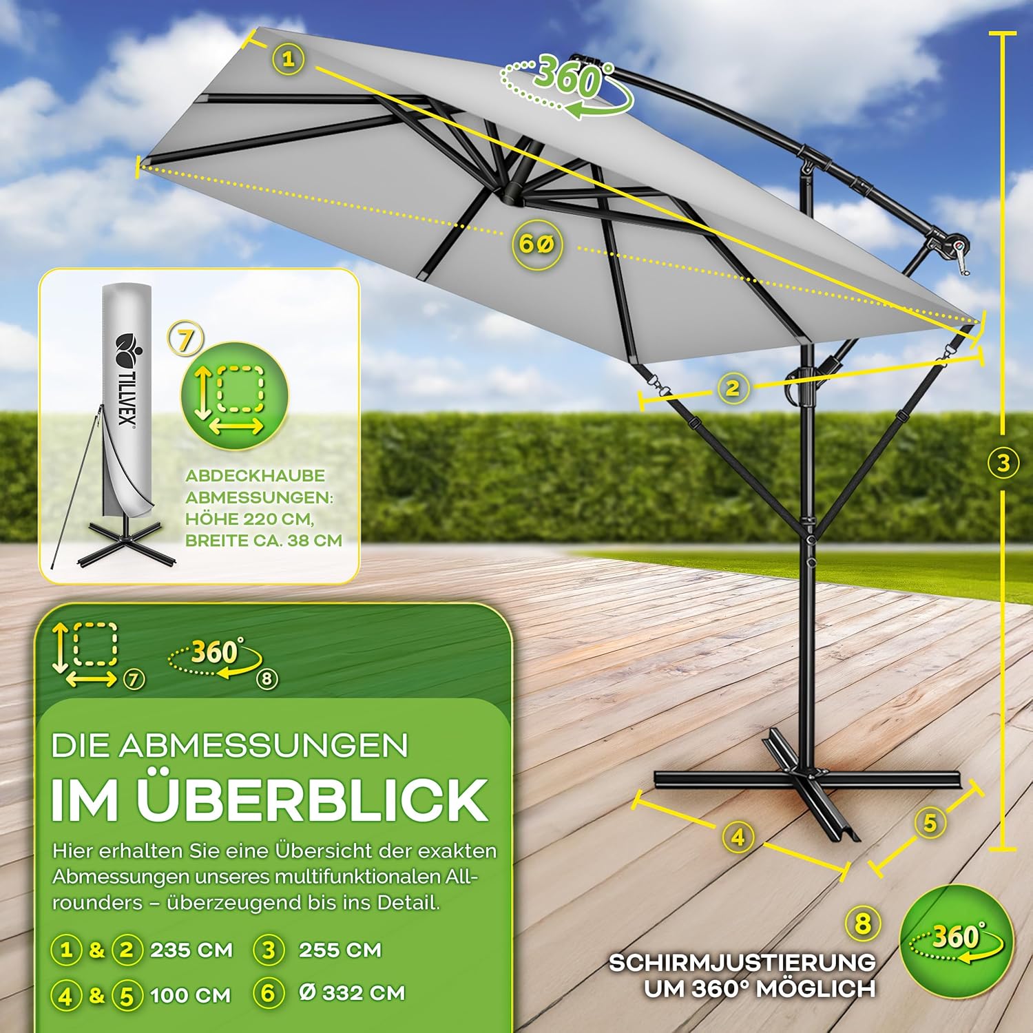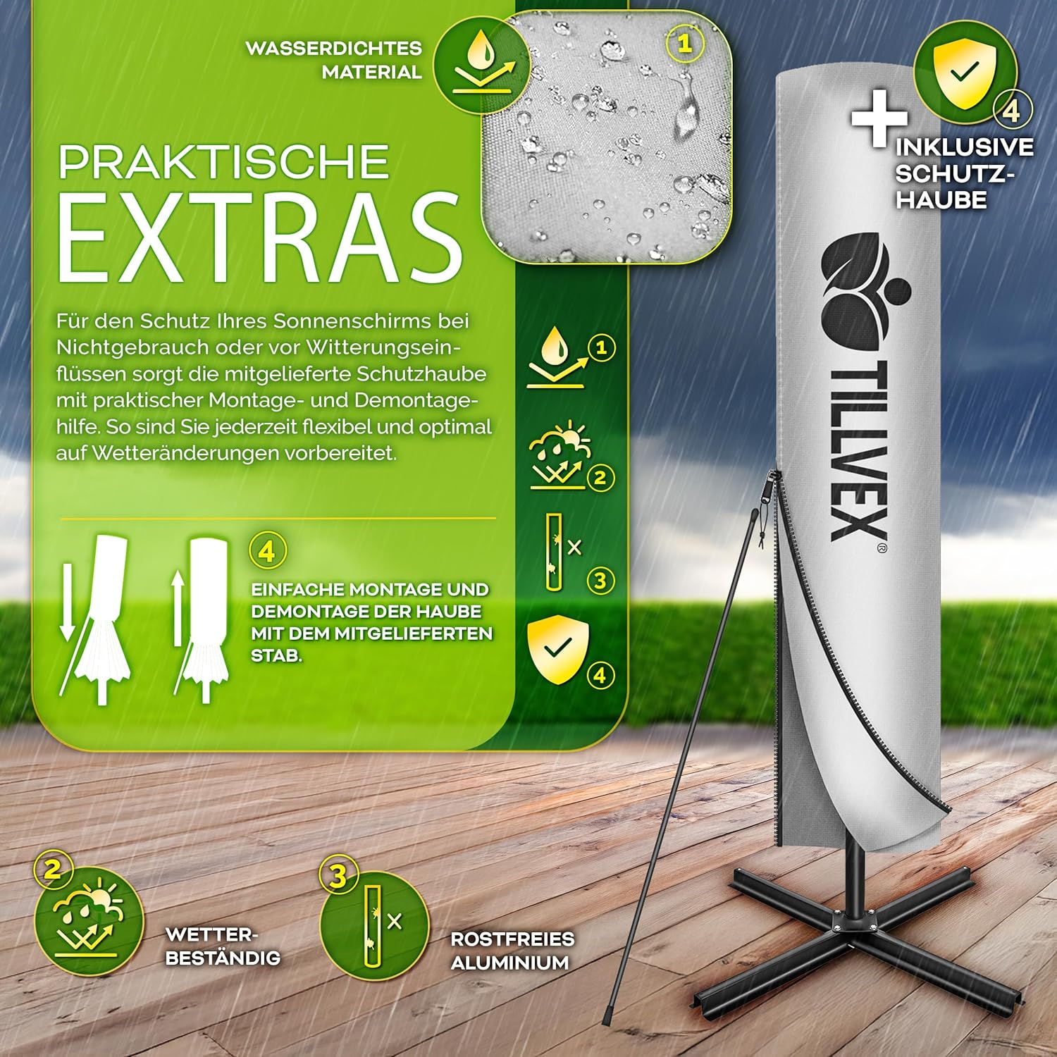 • Ideale schaduwdispenser: de rechthoekige parasol van tillvex van 330 cm biedt royale schaduw voor terras, balkon of tuin. De meegeleverde, waterdichte afdekking kan moeiteloos met een ritssluiting worden aangebracht en verwijderd. Dankzij de metalen staaf is de montage bijzonder eenvoudig en comfortabel.
