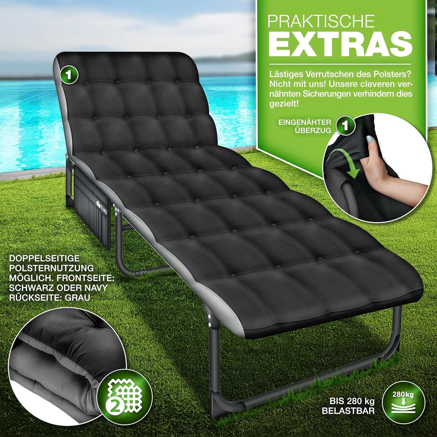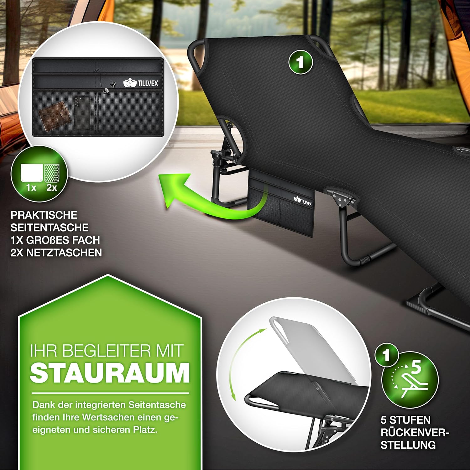 • Praktische zijtas: de tillvex relaxstoel is ook geschikt als vissersligstoel, visligstoel of karperligstoel. Het slaapbed is uitgerust met een groot zijvak waarin je je mobiele telefoon, waterflessen of andere persoonlijke voorwerpen kunt opbergen. Deze praktische tas maakt het mogelijk om belangrijke dingen binnen handbereik te hebben zonder op te staan.