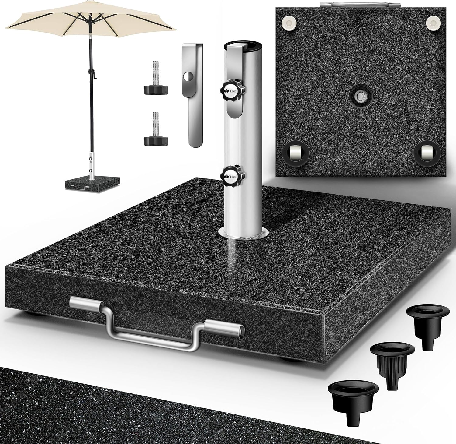 tillvex® Granit Parasolstandaard met wielen en transportgreep, 27 kg, vierkant, parasolvoet met roestvrijstalen buis, balkonparasolstandaard voor parasolstokken 16-48 mm en 250 cm diameter