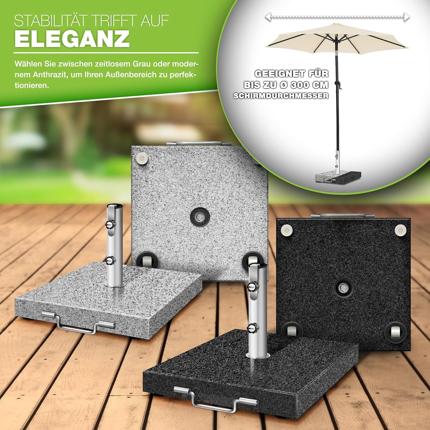 Stabiele constructie voor maximale standkracht: hoogwaardige 27 kg granieten parasolvoet vierkant. Afmetingen bodemplaat: 45 x 45 cm; plaatdikte ca. 5,5 cm. De balkonparasolstandaard zorgt voor een betrouwbare grip van je parasol en biedt maximale stabiliteit bij weer en wind. Geschikt voor parasolstangen van 16 - 48 mm en parasols tot 3 meter diameter – ideaal voor terras, tuin of café.