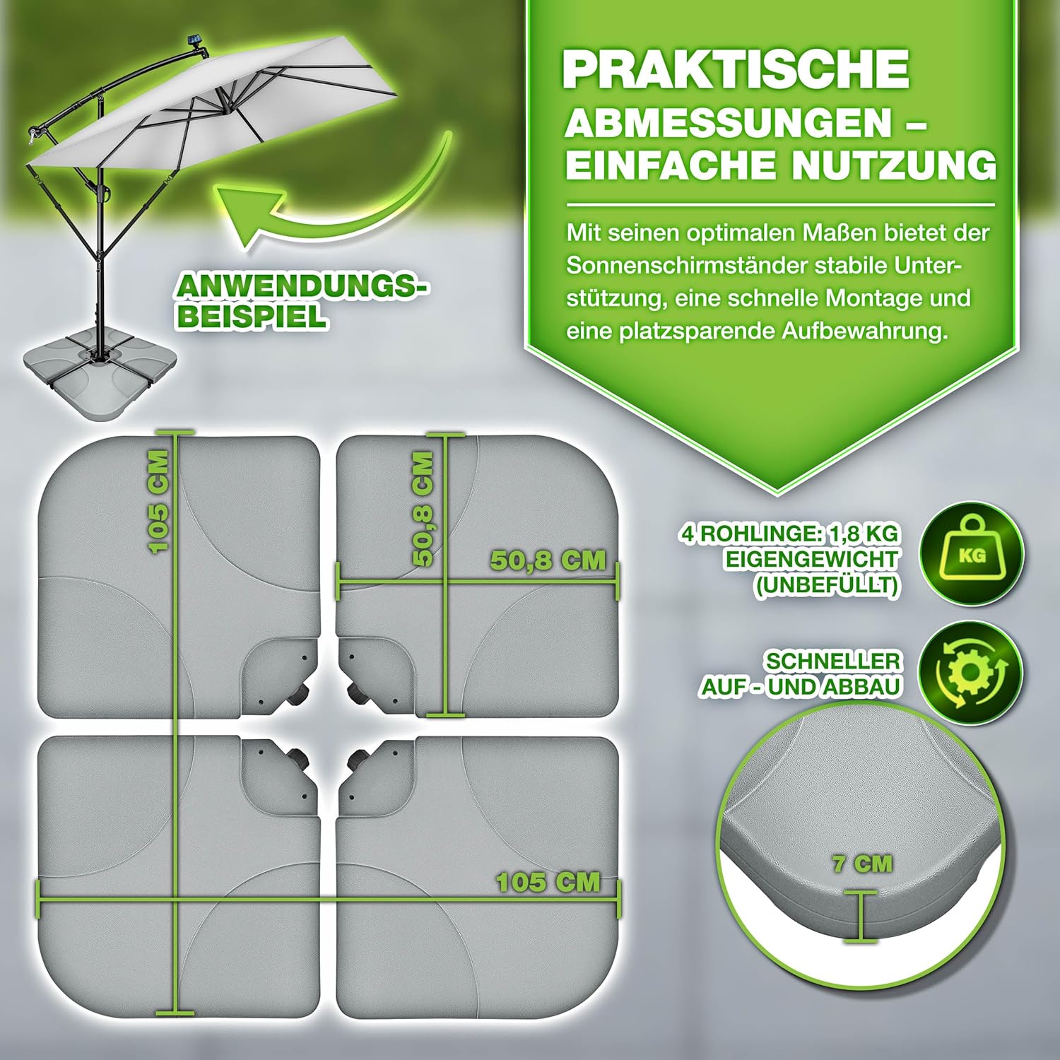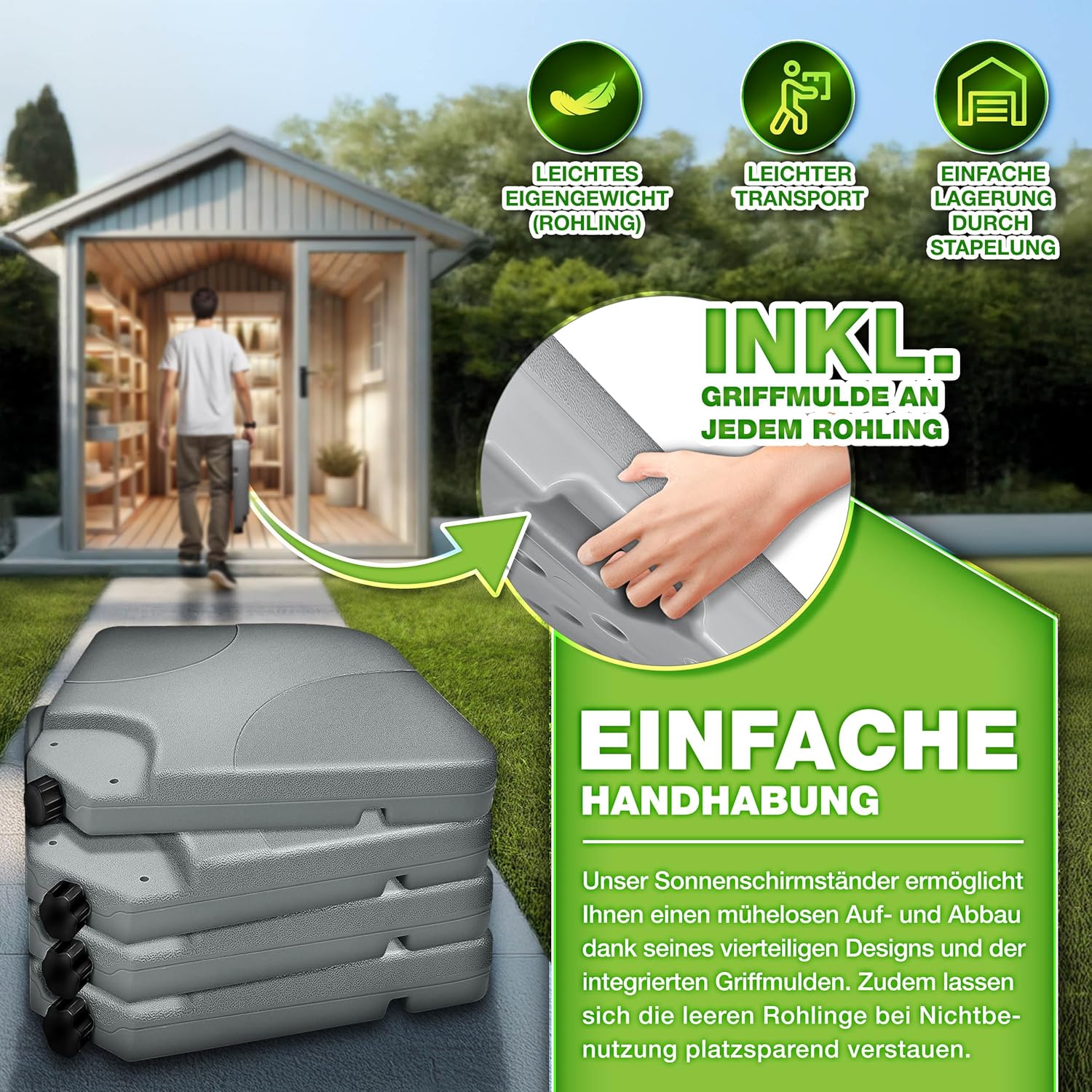 COMPACT ONTWERP: met zijn doordachte, ruimtebesparende ontwerp kan de standaard eenvoudig worden opgeborgen als hij niet in gebruik is. De vier modulaire parasolgewichten kunnen op elkaar worden gestapeld om opbergruimte te minimaliseren. Dankzij de ergonomische handgrepen kunnen de bodemplaten ook bij gevuld gewicht probleemloos naar de gewenste plaats worden verplaatst, perfect voor gebruik op balkon, terras of in de tuin.
