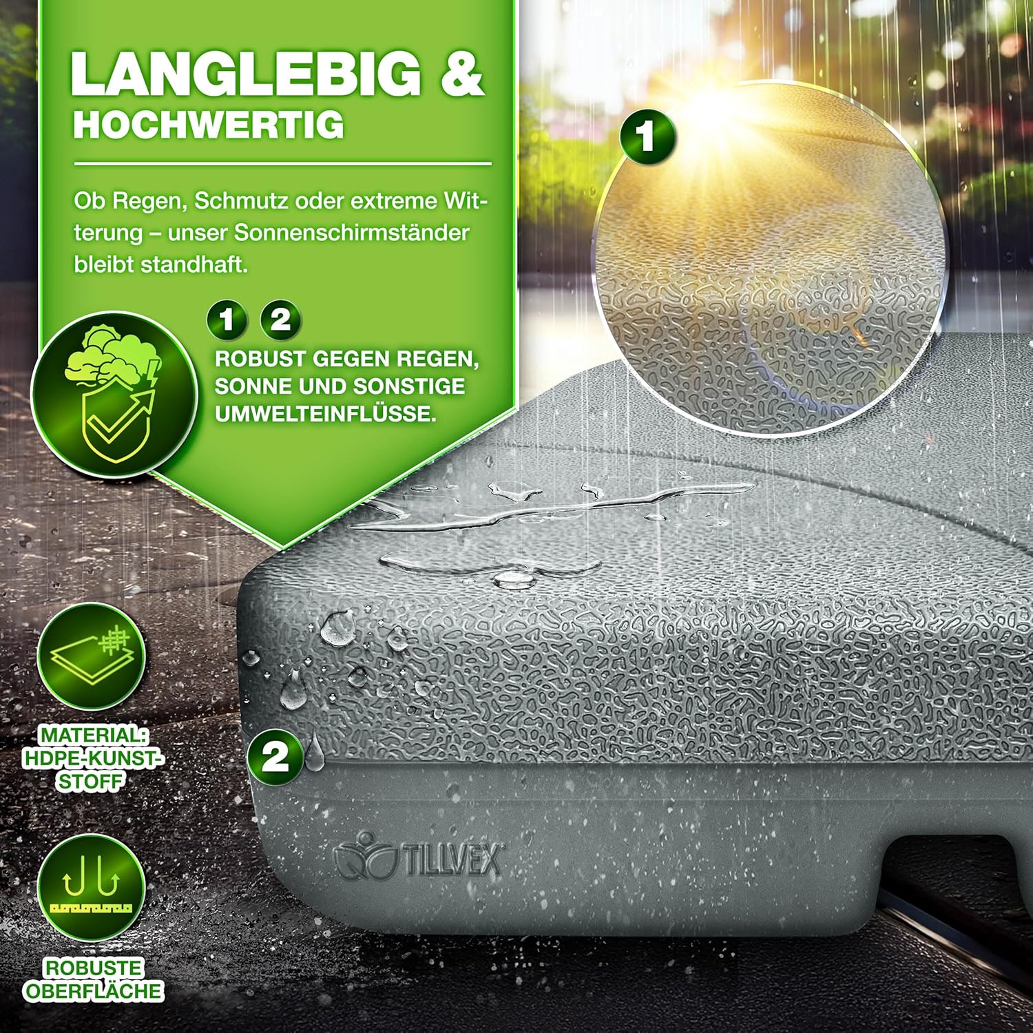 Duurzame kwaliteit: de robuuste HDPE-kunststof van de parasolstandaard is bijzonder goed bestand tegen UV-straling, corrosie en weersinvloeden. Ook bij langdurig zonlicht of regen blijft de sokkel functioneel en behoudt zijn vorm. Door deze hoogwaardige materiaalkeuze is de parasolstandaard bijzonder geschikt voor gebruik buitenshuis het hele jaar door en zorgt hij voor een lange levensduur.
