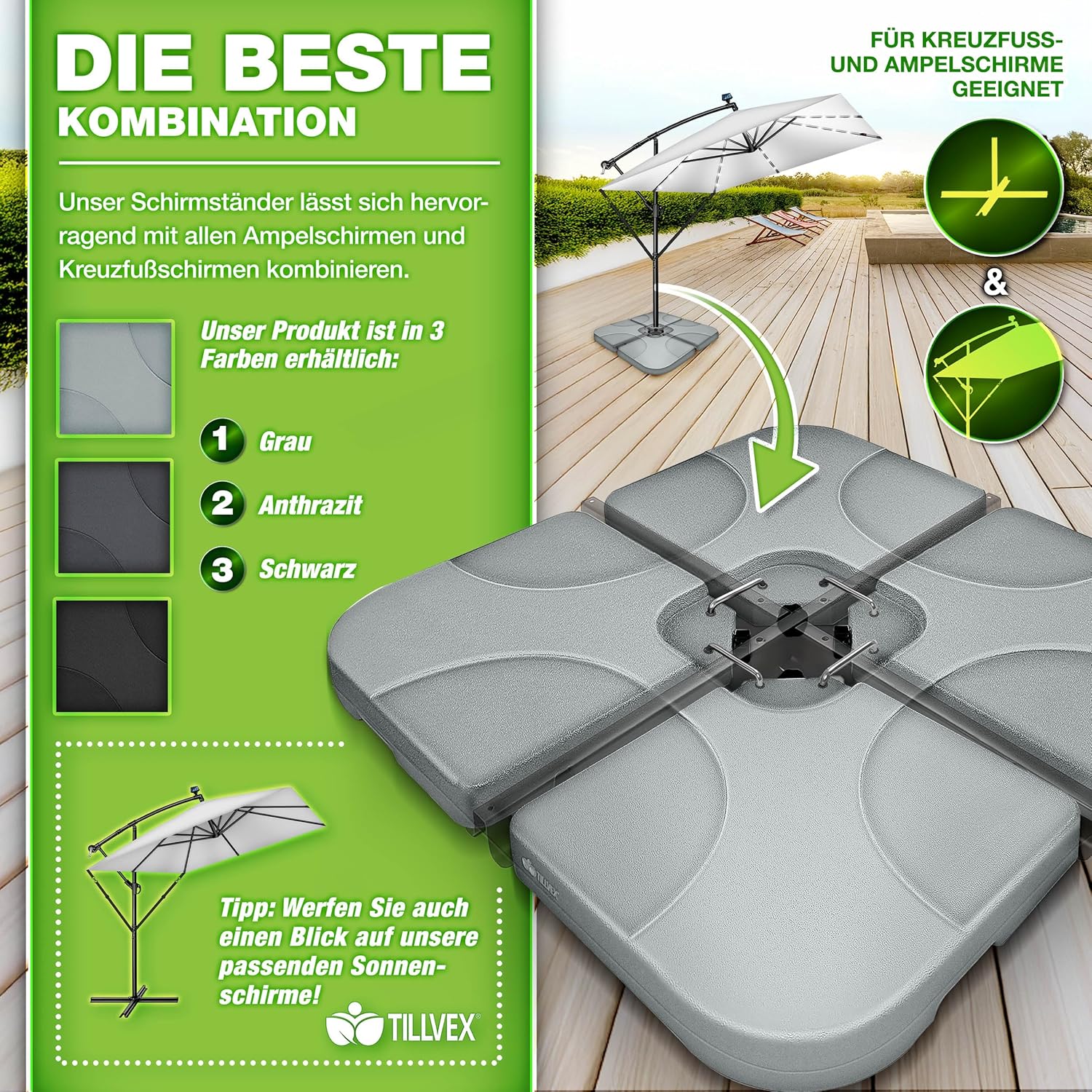 Ideaal voor parasol: geschikt voor alle gangbare zweefparasols met een kruisvoet. De drie elegante kleuren zwart, antraciet en grijs passen perfect bij de meeste buitenmeubels en creëren een harmonieuze sfeer. Kies de juiste kleur en combineer de parasolstandaard met onze veelzijdige zweefparasols van het merk tillvex.