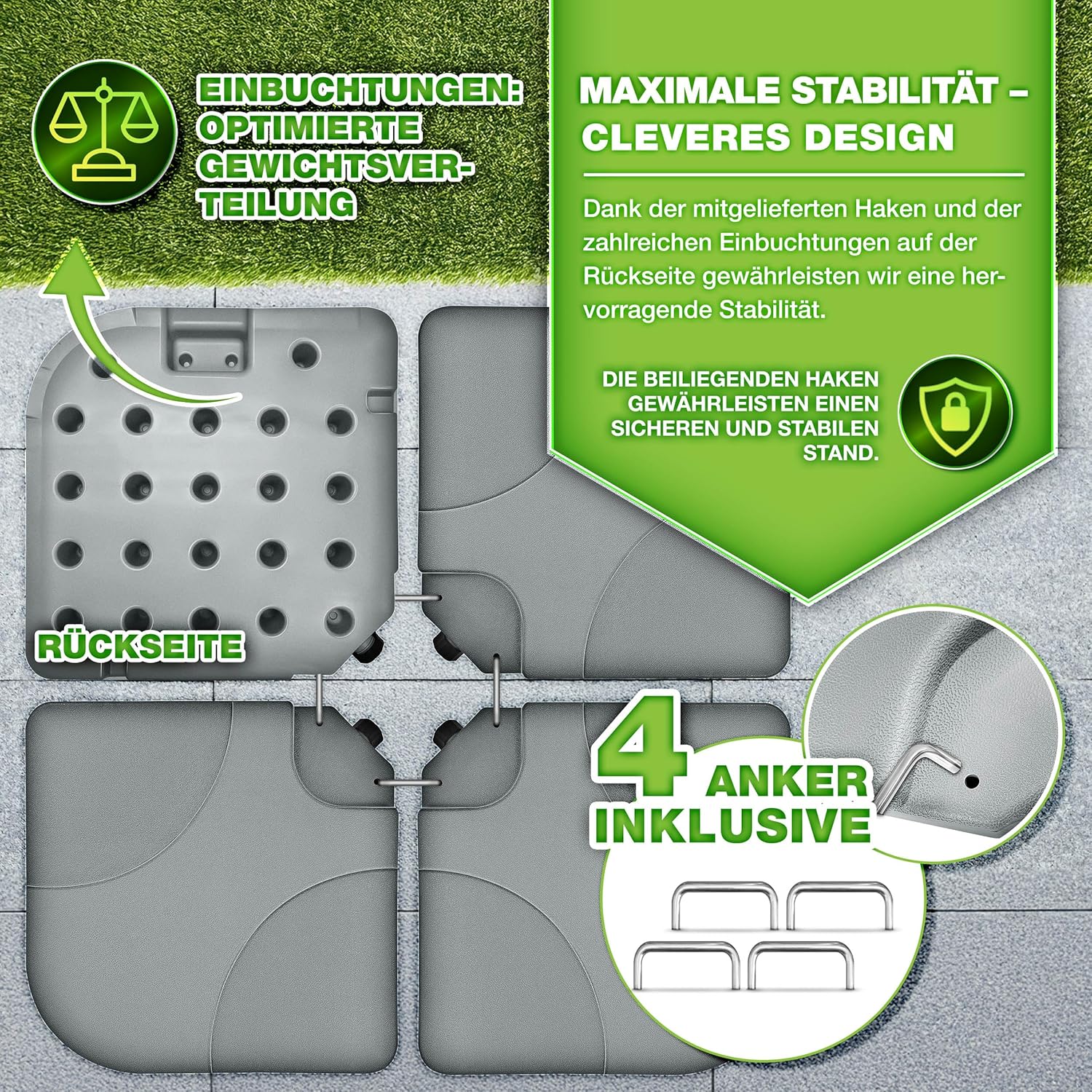 Stabiele grip ook bij wind en weer: dankzij het geoptimaliseerde ontwerp met speciale uitsparingen voor gelijkmatige gewichtsverdeling blijft de parasolvoet ook bij sterke wind stabiel. Extra veiligheid bieden de vier meegeleverde ankers die omvallen voorkomen. Deze balkonparasolstandaard is ideaal voor gebruik in windgevoelige gebieden of op grote terrassen en tuinoppervlakken, waar wind een probleem kan zijn.