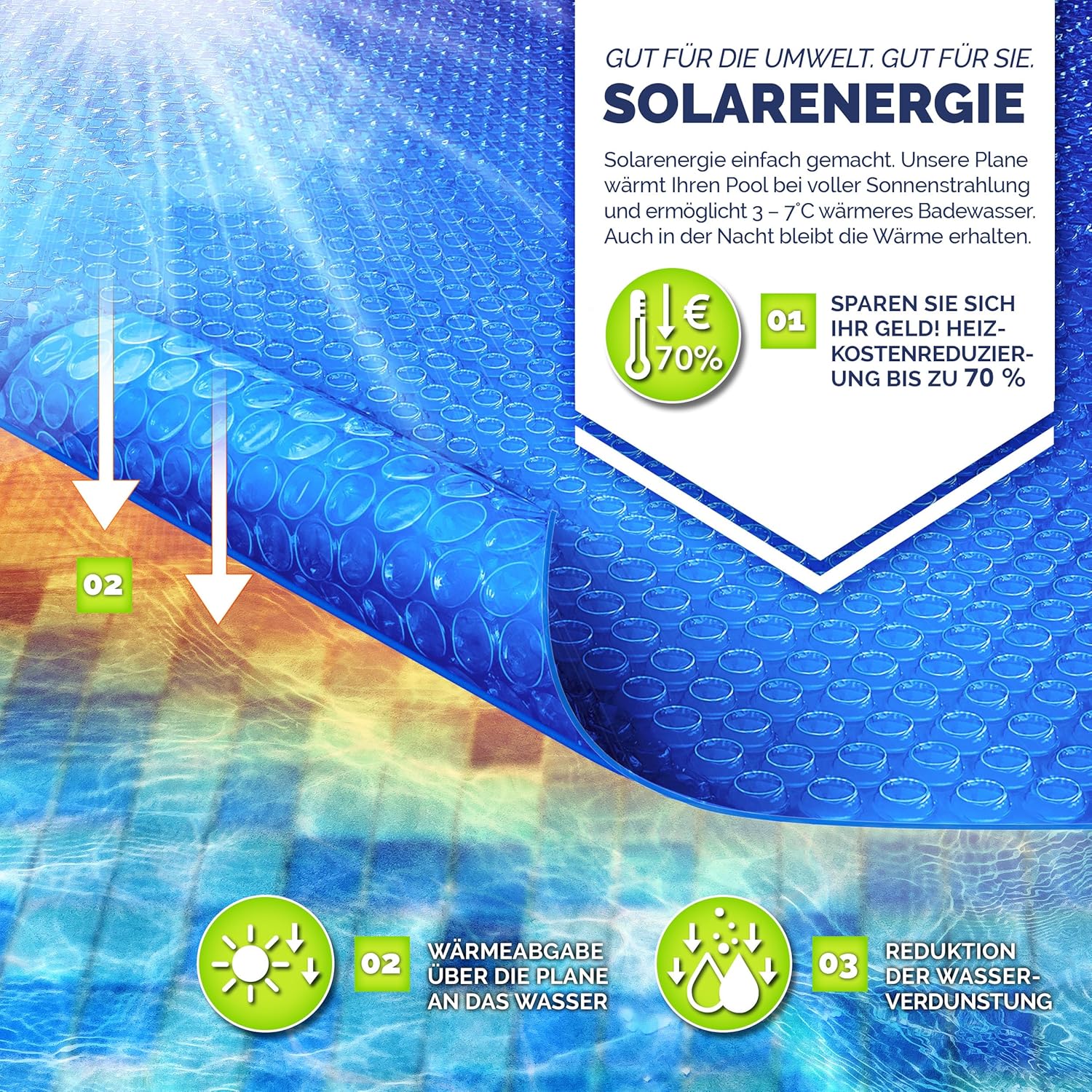 • MILIEUVRIENDELIJK VERWARMEN: hoogwaardige zwembadzonnefolie voor milieuvriendelijk en zuinig opwarmen van het water door zonne-energie. De besparing op verwarmingskosten bedraagt 70 procent.
