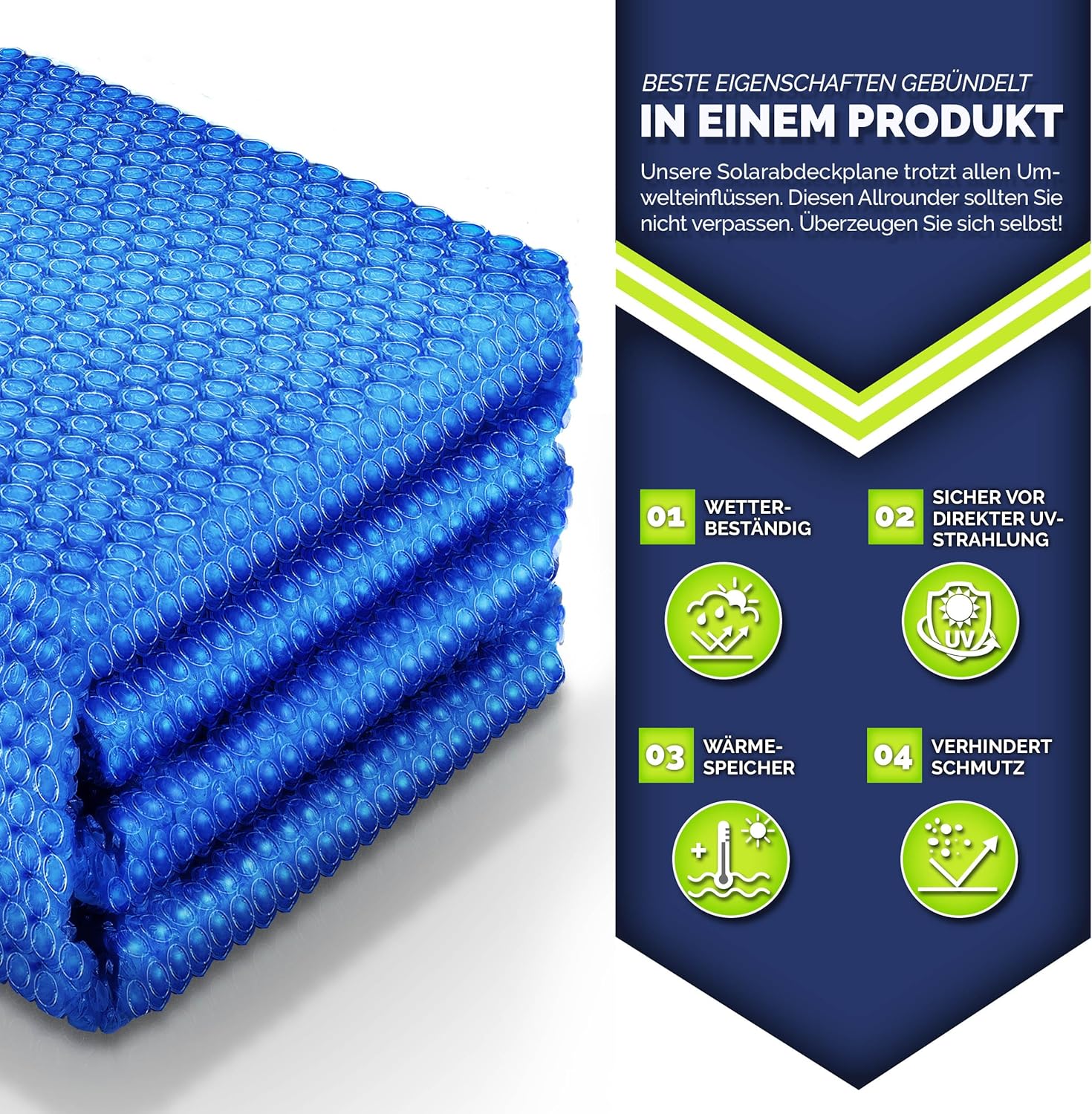 Daarbij geven de noppen aan de onderkant de warmte direct aan het water af. De zonnefolie wordt daarbij over het zwembad getrokken en dient dus tegelijkertijd ook als dekzeil en beschermt tegen vuil. Het opwarmen met een zonnepaneel is daarbij aanzienlijk versterkt dan met een gewoon dekzeil.