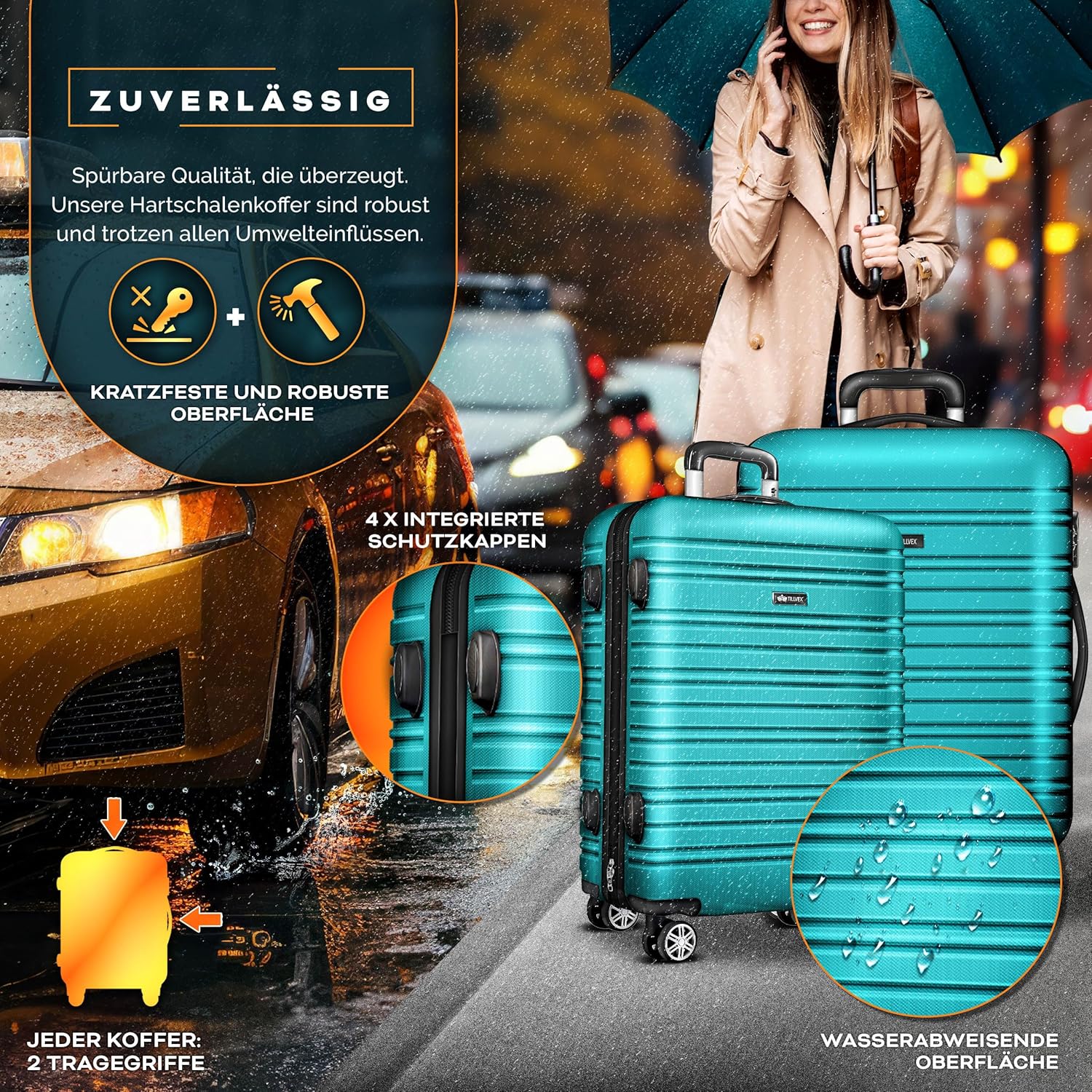 - ABS harde schaal voor ultieme bescherming: onze 3-delige tillvex reiskofferset met wielen is gemaakt van zeer flexibel ABS-kunststof dat bestand is tegen stoten en krassen. Door speciaal gevormde hoekbeschermers en kunststof voeten bieden ze extra robuustheid en bescherming voor je bagage.