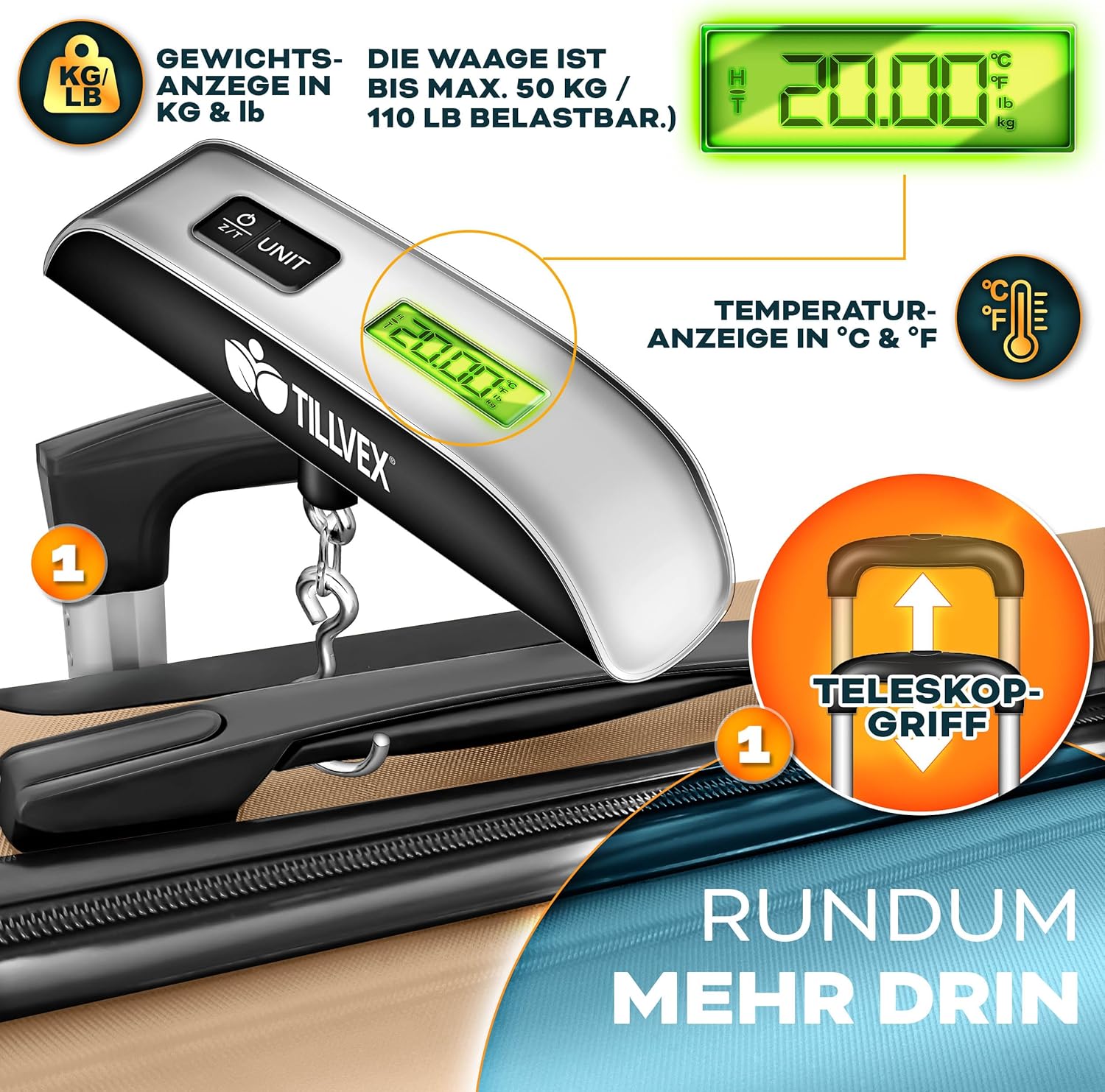 • Maximaal comfort: de tillvex koffers zijn uitgerust met een in hoogte verstelbare telescopische handgreep, twee kunststof handgrepen en 360° draaiwielen. Dit garandeert niet alleen maximaal draagcomfort bij deze rolkoffer, maar ook moeiteloze beweeglijkheid, zelfs op drukke luchthavens.
