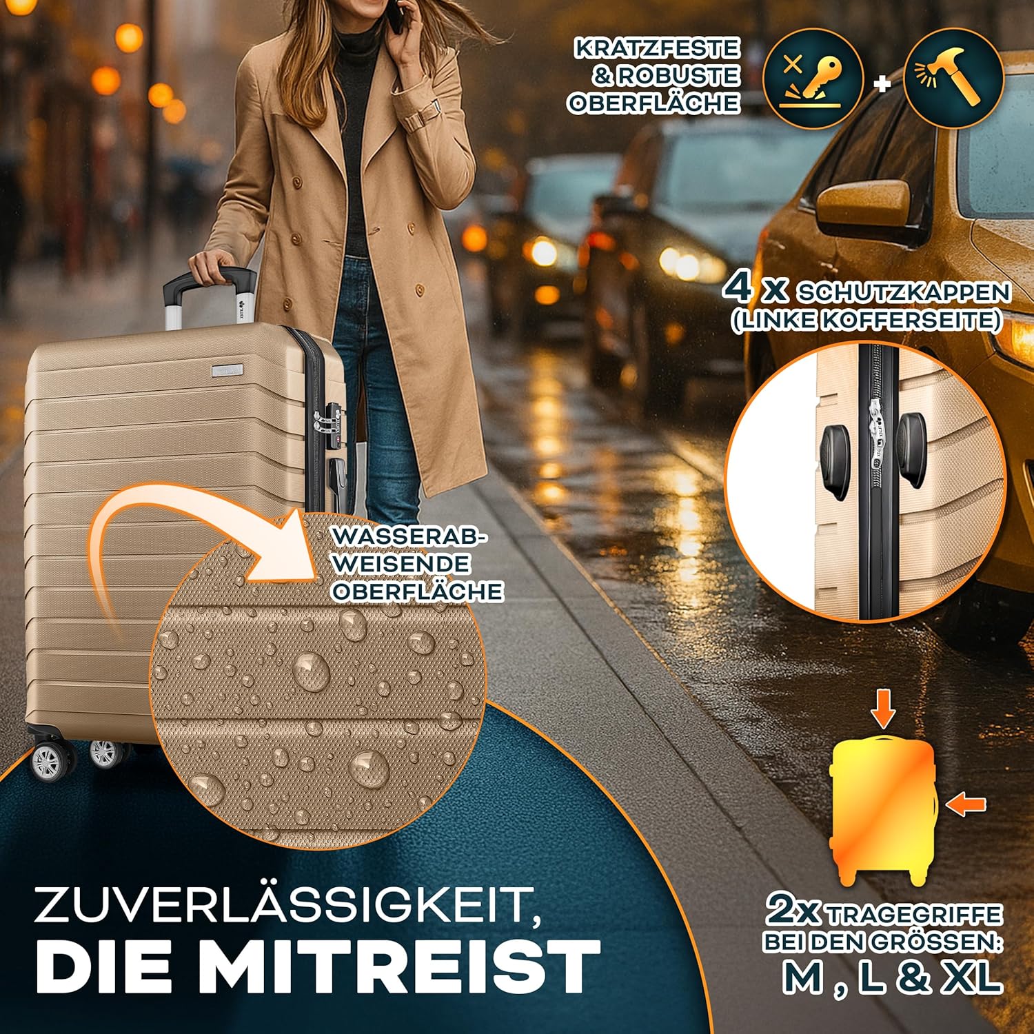 • ABS harde schaal voor ultieme bescherming: onze 4-delige tillvex reiskofferset met wielen is gemaakt van zeer flexibel ABS-kunststof dat bestand is tegen stoten en krassen. Versterkte hoeken en kunststof poten aan de zijkant zorgen voor extra stabiliteit en duurzaamheid, ideaal voor elke reis.