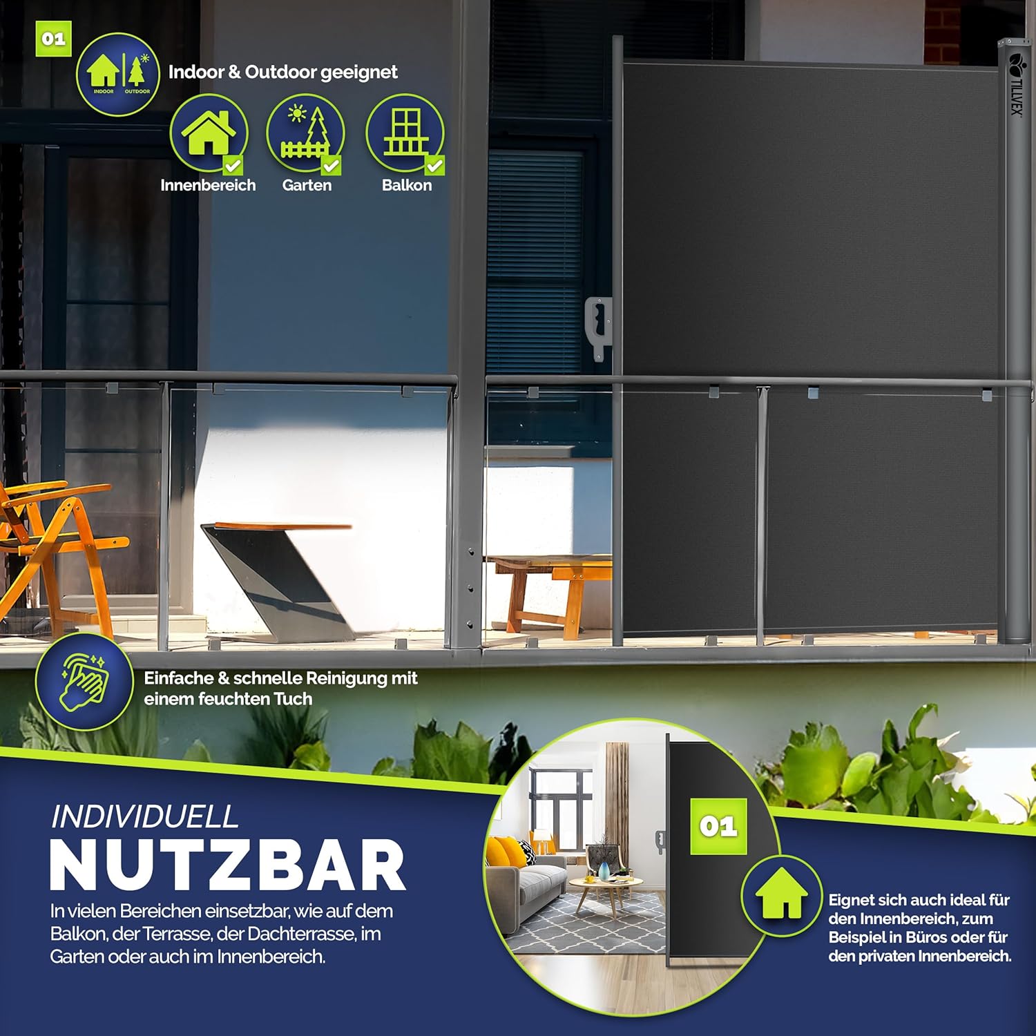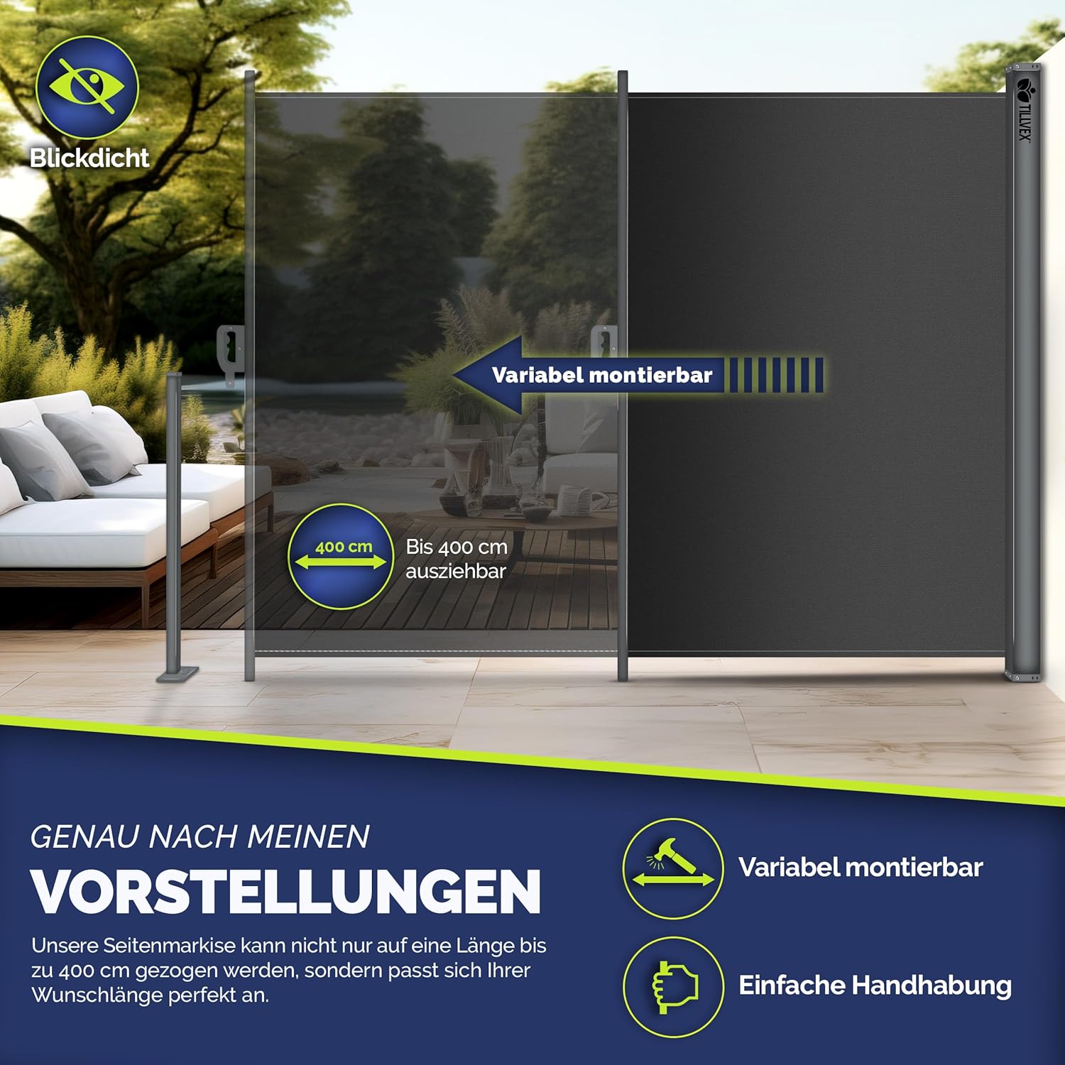 • Maximale privacy en bescherming: onze royale zijluifel creëert een privé oase op je balkon, tuin of terras. Geniet van ongestoorde momenten en bescherm jezelf betrouwbaar tegen nieuwsgierige blikken van de buren. De hoogwaardige polyester bekleding (220 g/m²) met waterafstotende PU-coating biedt langdurige bescherming tegen zon, regen en uv-stralen (UV50+) om je privacy te behouden en je luifel te beschermen.