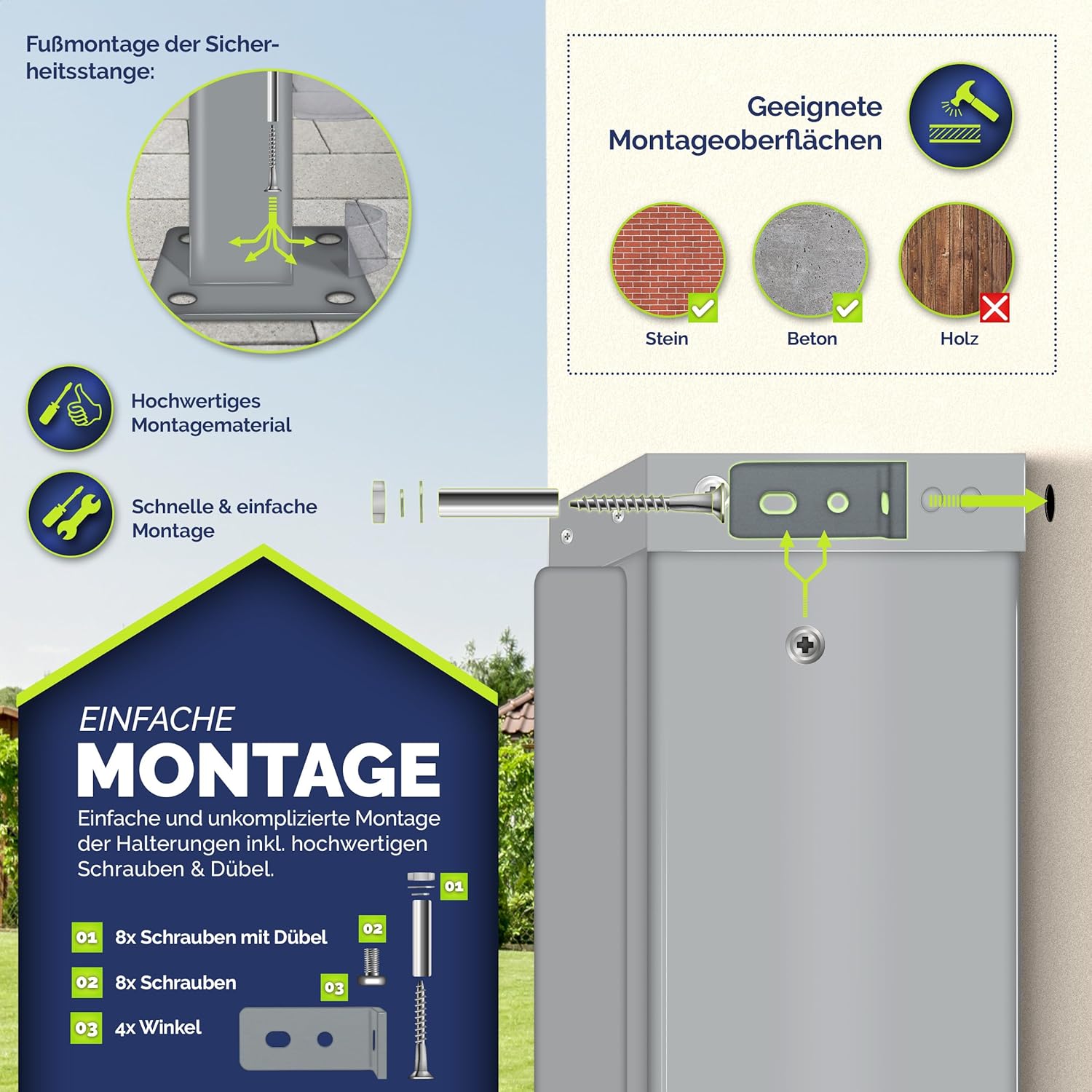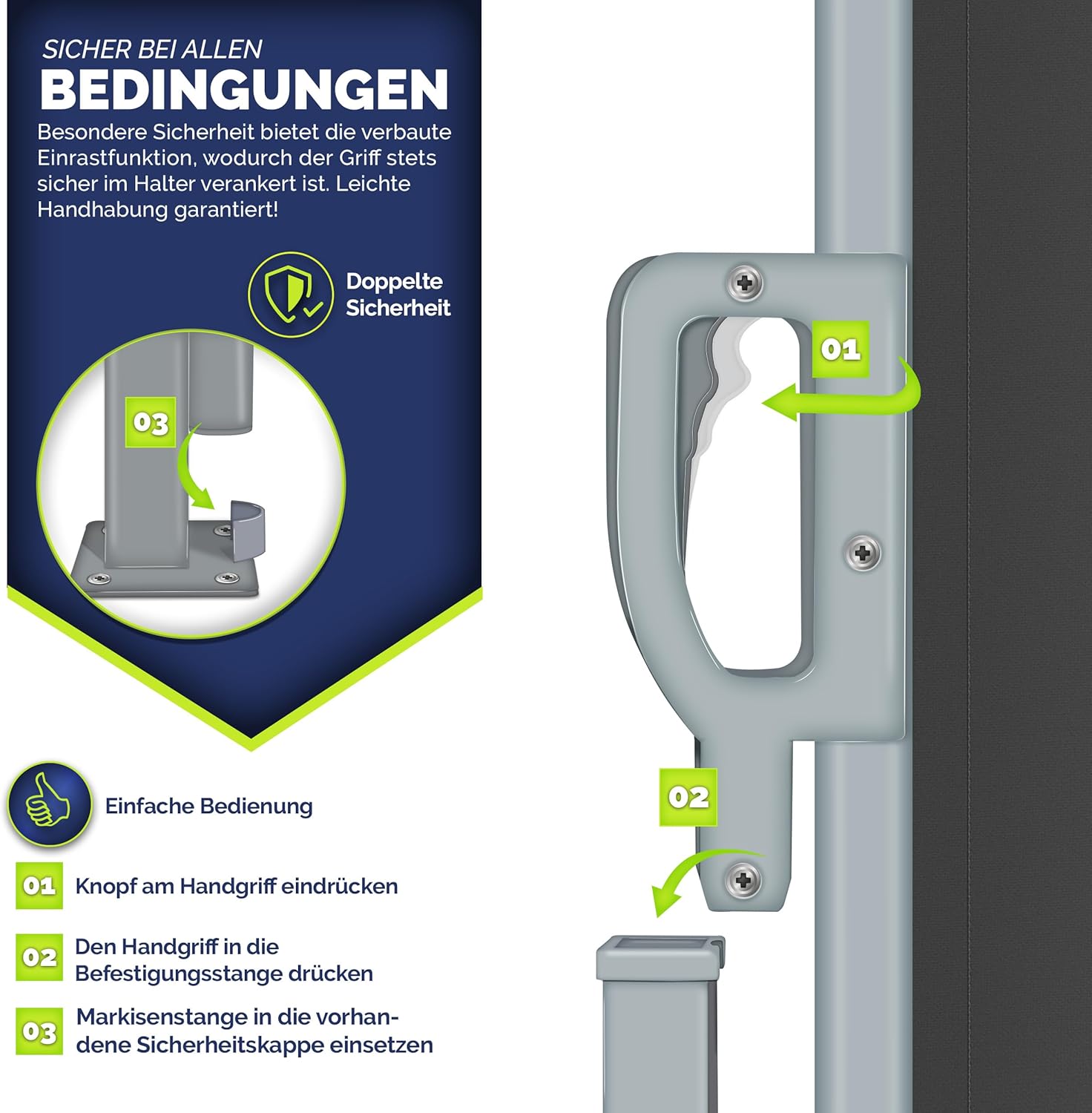• Eenvoudige montage en flexibiliteit: de montage van deze inkijkbescherming is dankzij de meegeleverde handleiding en de accessoires kinderlijk eenvoudig. De wandhouder en de bodemverankering bieden flexibele installatiemogelijkheden voor een op maat gemaakte oplossing die aan je behoeften voldoet. Met een paar eenvoudige stappen kun je je luifel veilig en stabiel bevestigen om van onmiddellijke bescherming en privacy te genieten.