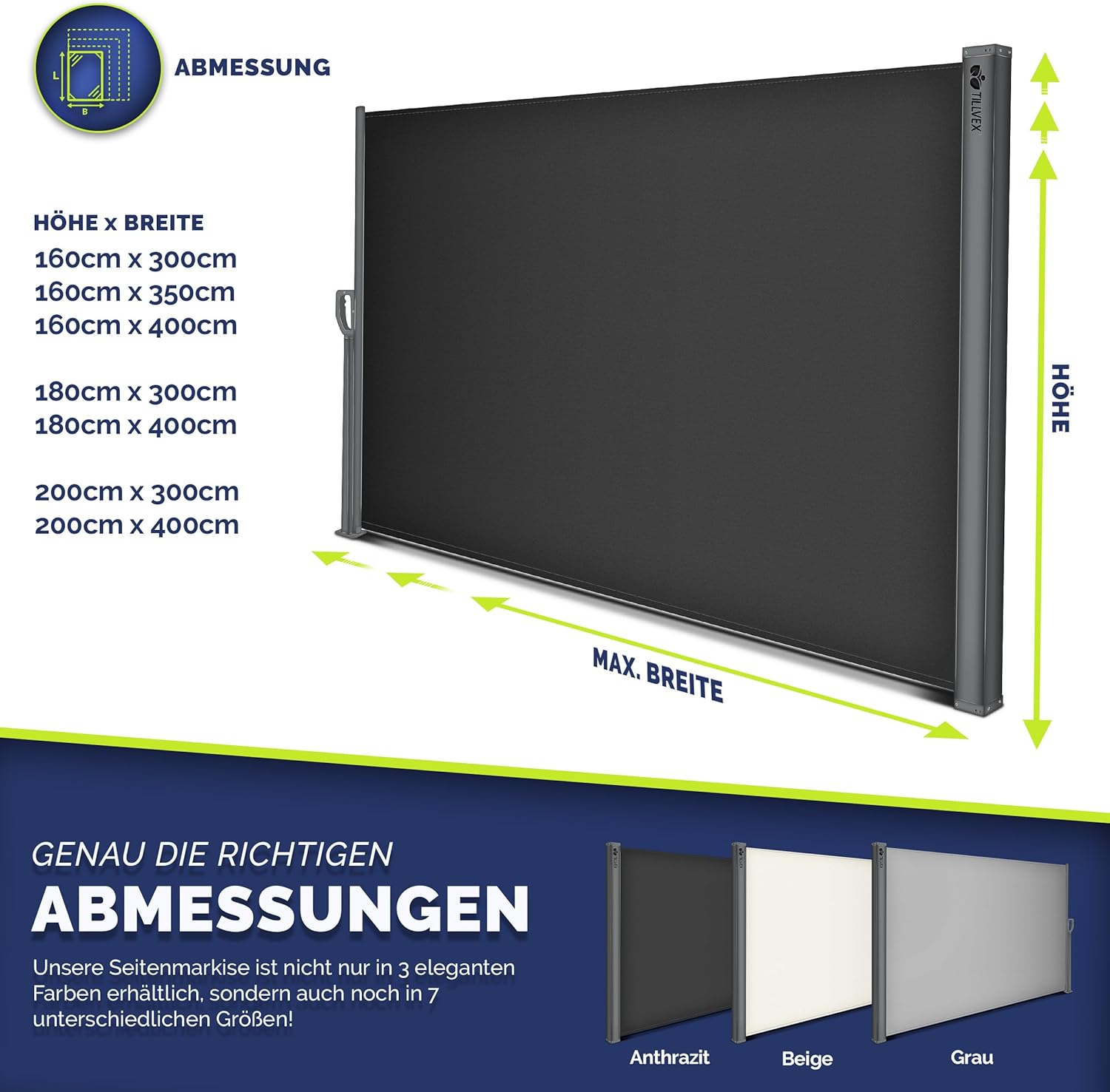 tillvex® Zijluifel uittrekbaar en ondoorzichtig, inkijkbescherming voor balkon, tuin en terras, zijrolgordijn met wandhouder, zonwering van roestvrij staal, luifel (antraciet, 160 x 400 cm)
