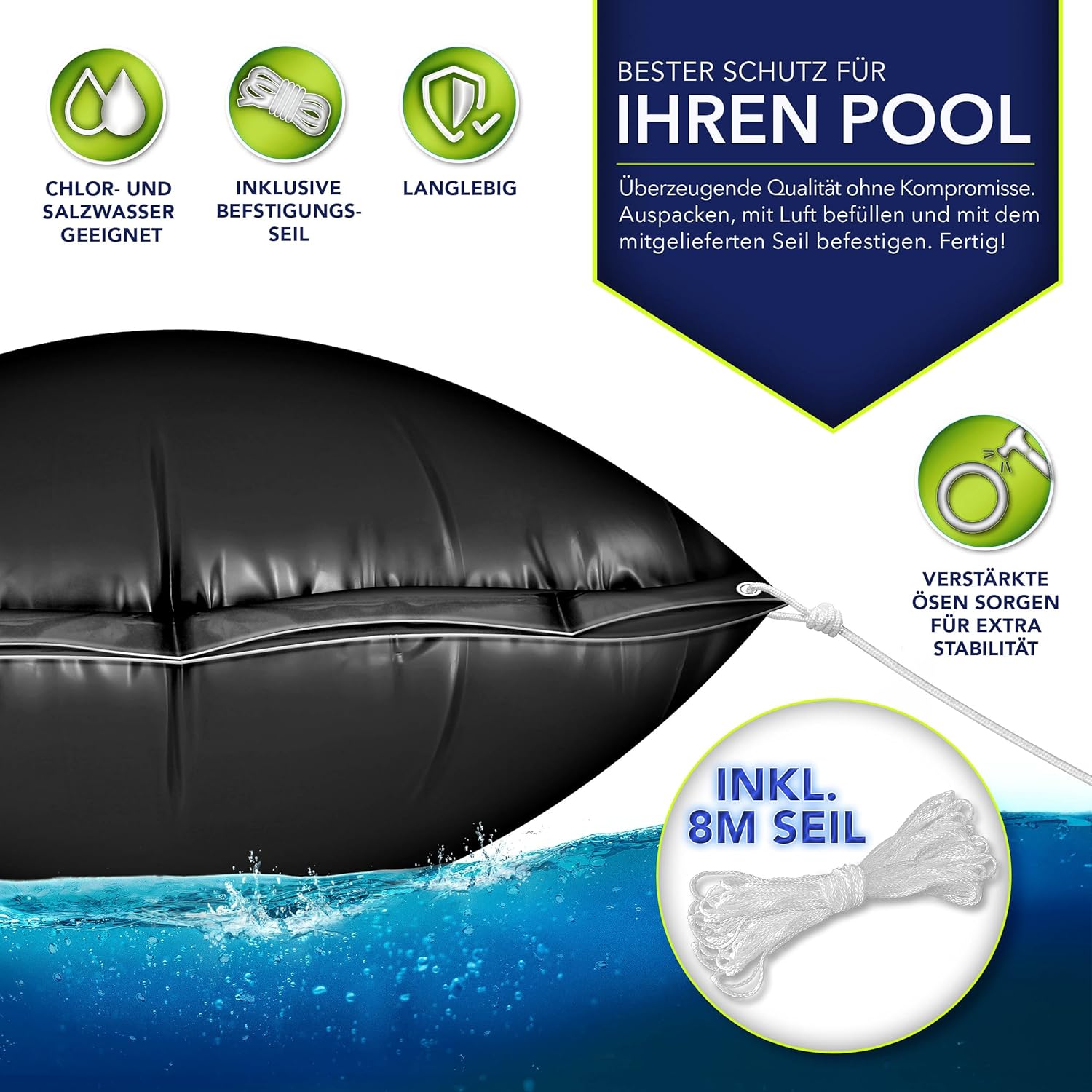 • Bescherming voor je zwembad: in de winter of bij langere afwezigheid - onze zwembadluchtkussens garanderen een betrouwbare bescherming voor je zwembad. Ze zijn probleemloos bestand tegen regen, hagel en sneeuw en zorgen ervoor dat je zwembad veilig en schoon afgedekt blijft. Geniet van de zekerheid dat je zwembad goed beschermd is, ongeacht de weersomstandigheden.