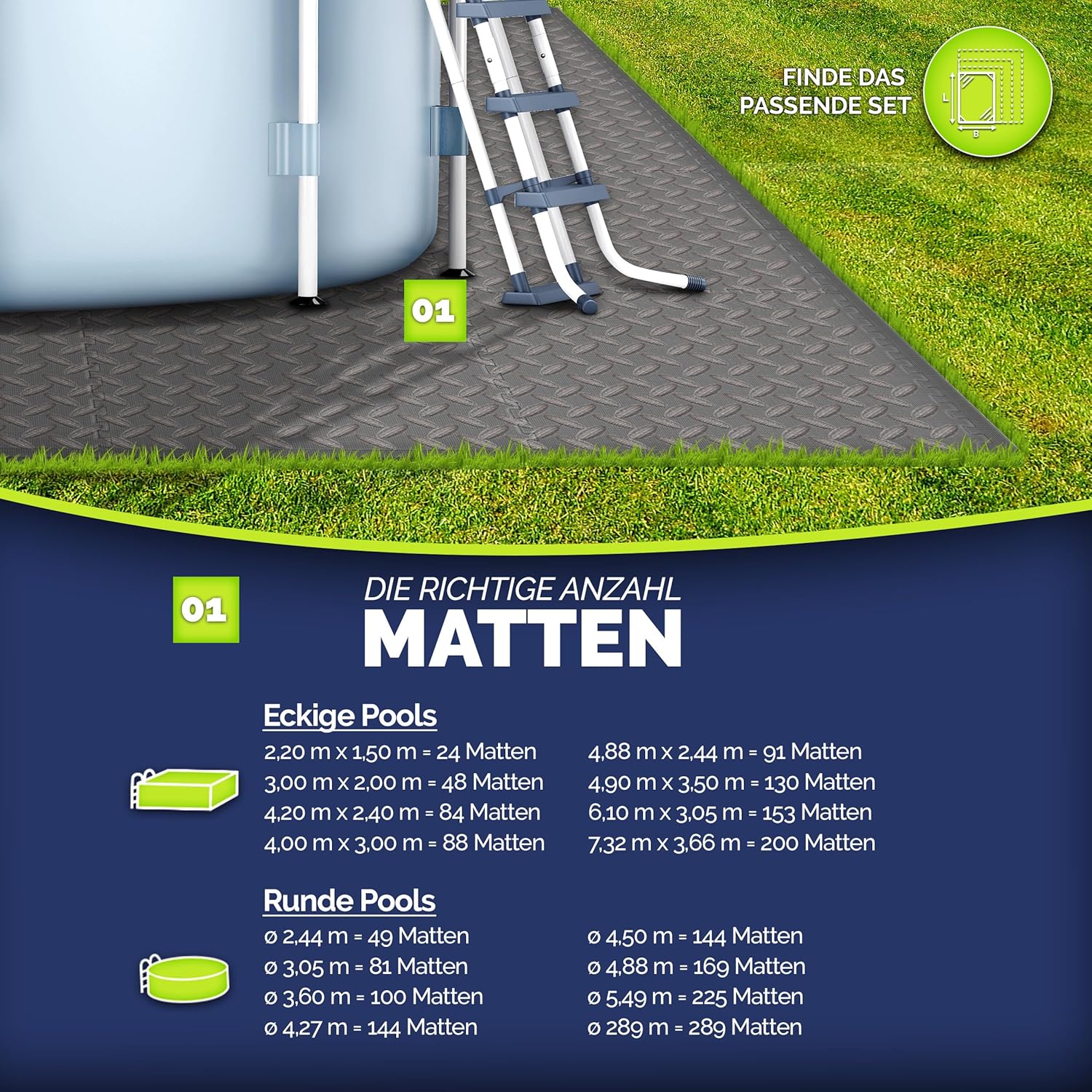 De Tillvex zwembad-onderlegmatten met de afmetingen 38,5 x 38,5 x 1 cm, inclusief de randstukken, bieden een eenvoudige installatie en passen zich flexibel aan verschillende zwembadmaten en -vormen aan. Deze veelzijdige zwembadmat vormt een stabiele basis voor je zwembad en vergemakkelijkt de vormgeving van je buitenruimte.