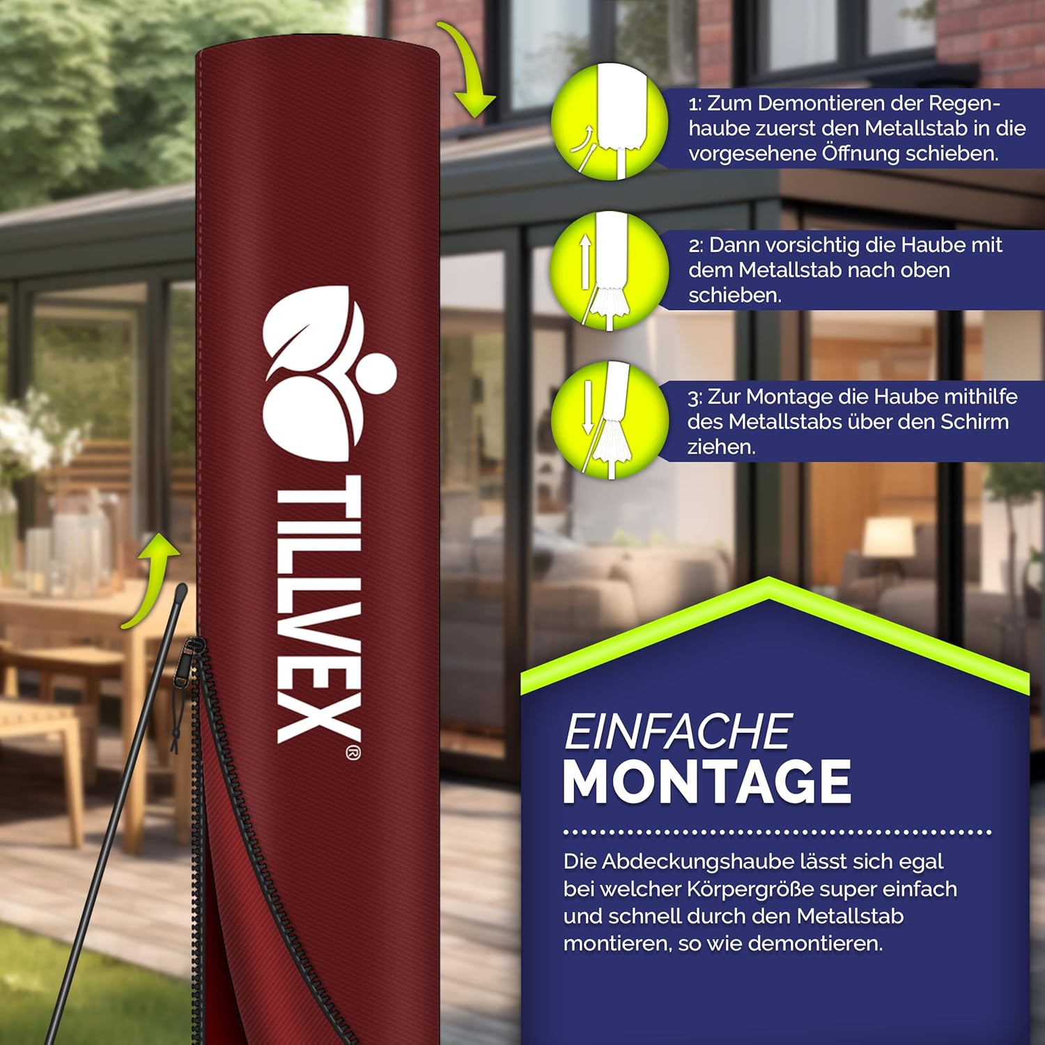 • Ideale schaduwdispenser: de tillvex parasol wordt geleverd met een hoogwaardige, waterdichte hoes, die moeiteloos met een ritssluiting kan worden gemonteerd en gedemonteerd. De praktische toevoeging van een metalen staaf vergemakkelijkt het proces nog eens door de montage en demontage van de afdekking bijzonder eenvoudig te maken.