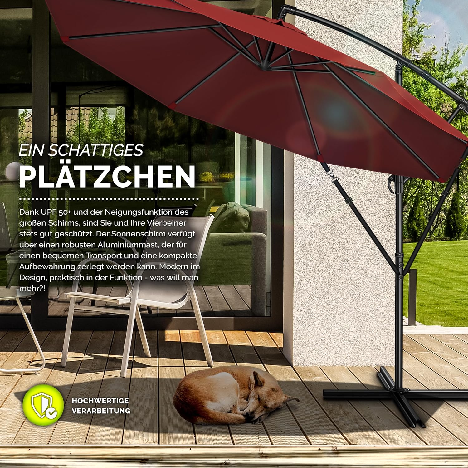 • Eenvoudig te verstellen: deze parasol van roestvrij aluminium biedt maximale flexibiliteit door zijn 360° draaibaarheid. Daardoor kan de parasol gemakkelijk in verschillende richtingen worden uitgelijnd om aan de schaduwbehoefte afhankelijk van het moment van de dag en de stand van de zon te voldoen. De parasol is uitgerust met een extra windbeveiliging. Deze intelligente windbeveiliging garandeert een bijzonder stabiel gebruik van de aluminium zweefparasol, zelfs bij winderige omstandigheden.