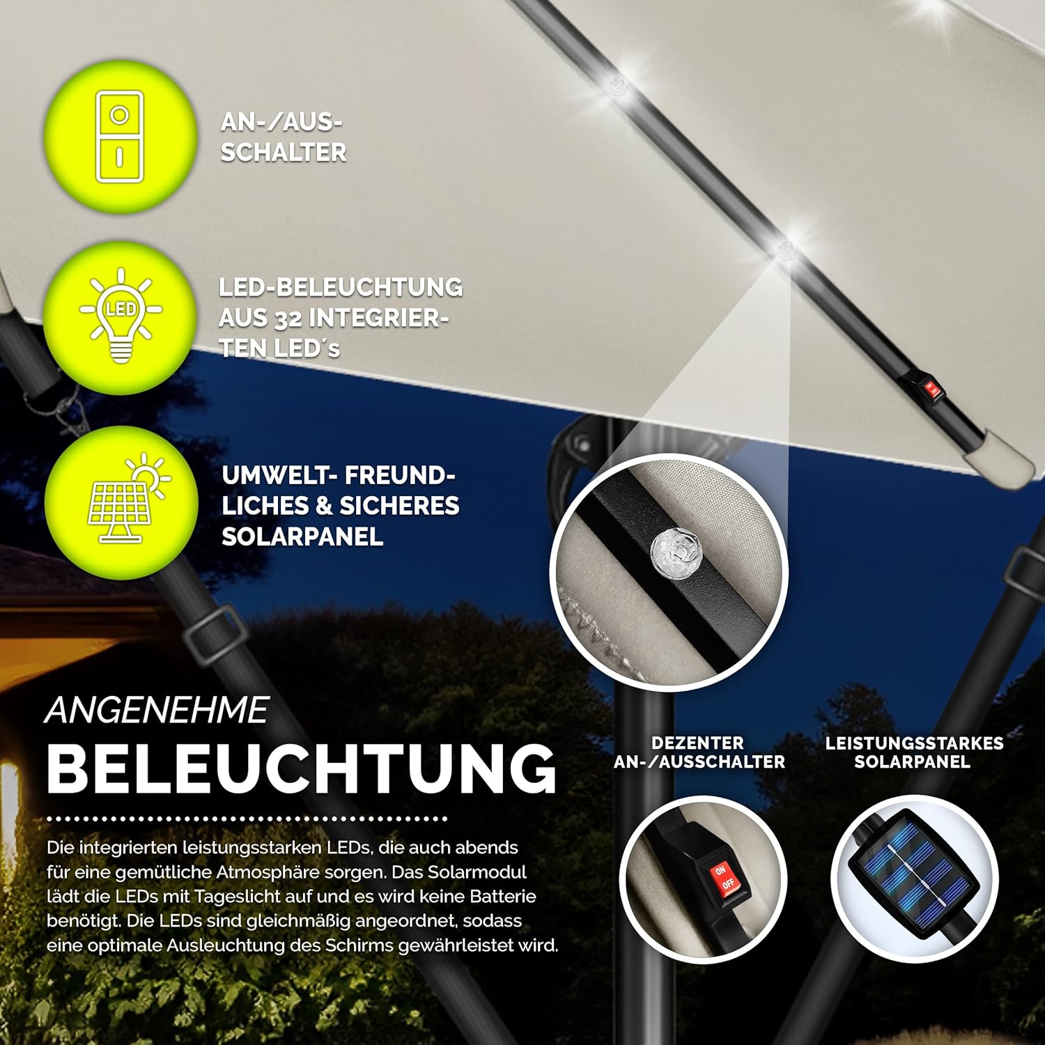 - Sfeervolle verlichting: grote parasol met 32 ledlampen (gezellig warm licht) en Ø 350 cm voor een grote schaduw. Het krachtige zonnepaneel zorgt voor voldoende stroom. De bediening gebeurt door middel van een aan-/uitschakelaar.