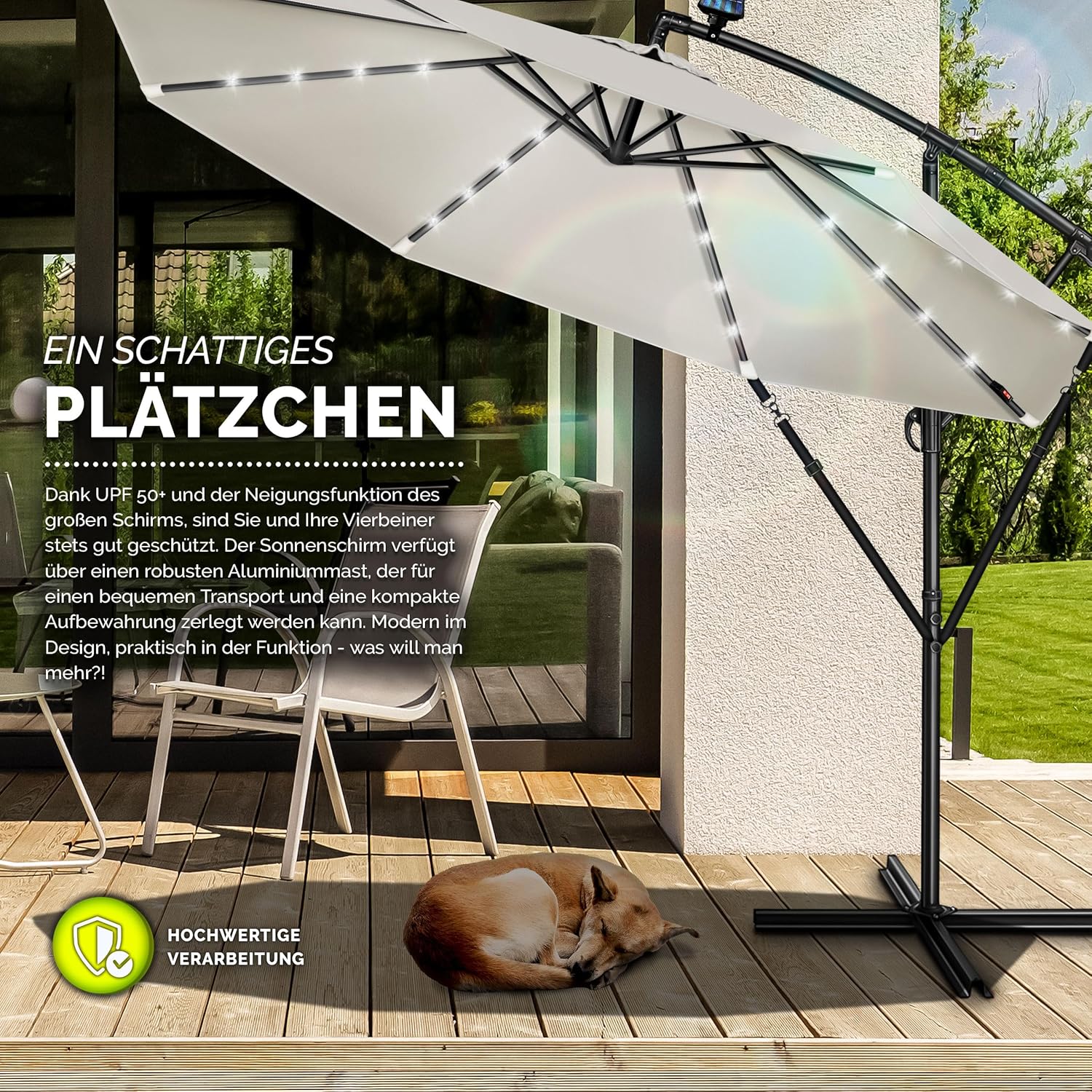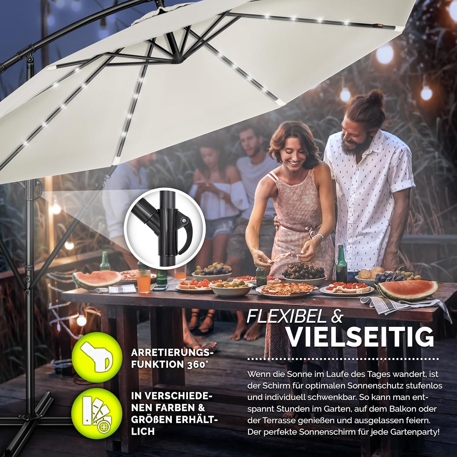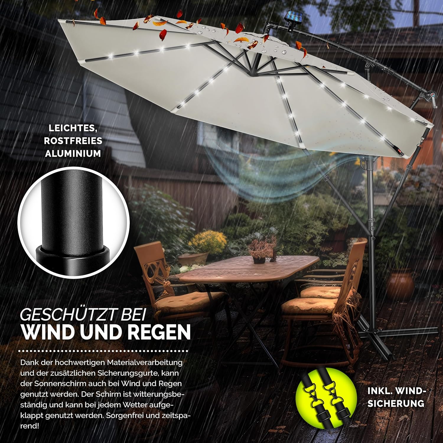 tillvex Aluminium zweefparasol, led, zonne-energie, Ø 300 cm, met zwengel, parasol met aan-/uitschakelaar, tuinscherm, uv-bescherming aluminium, zwengelparasol met standaard, marktscherm, waterdicht