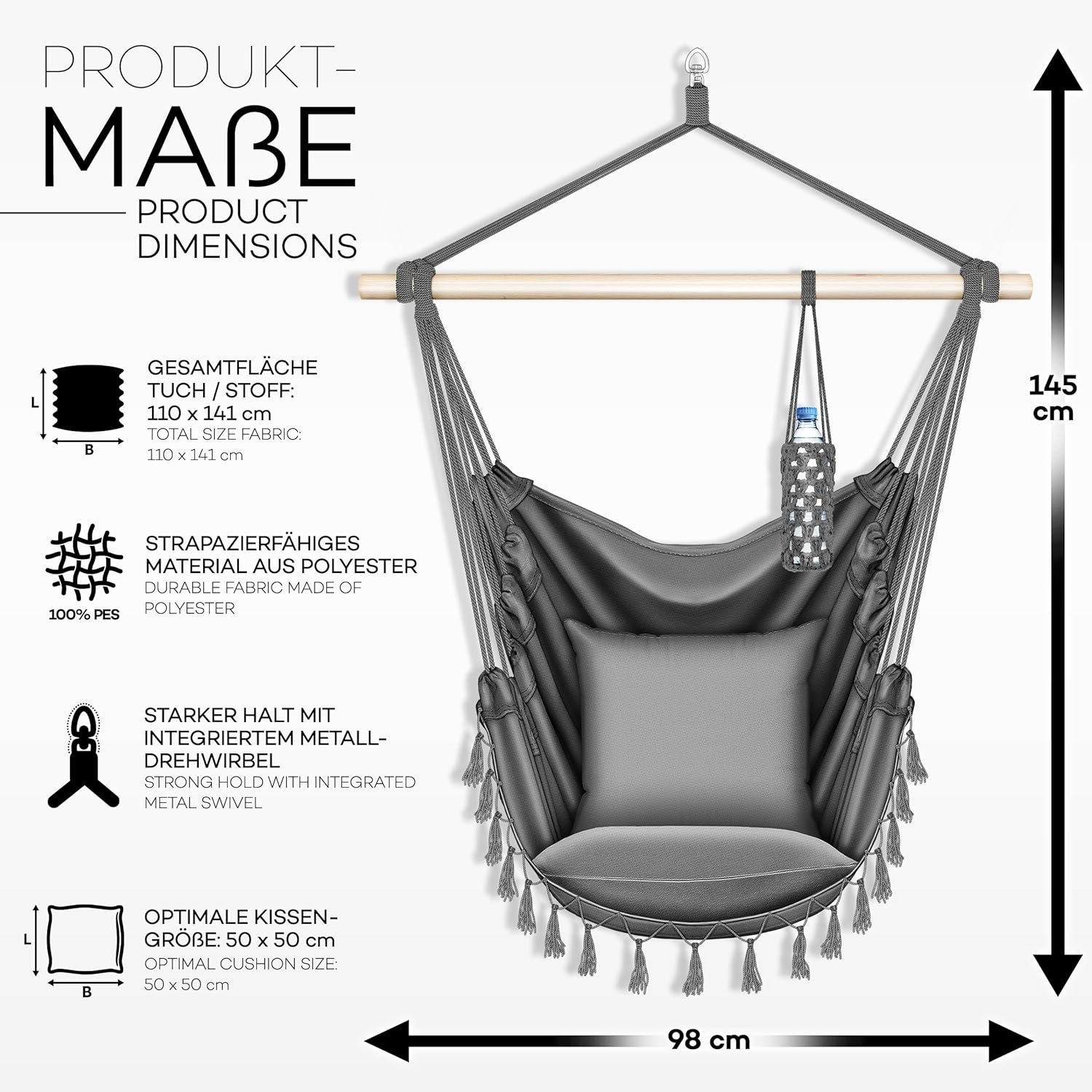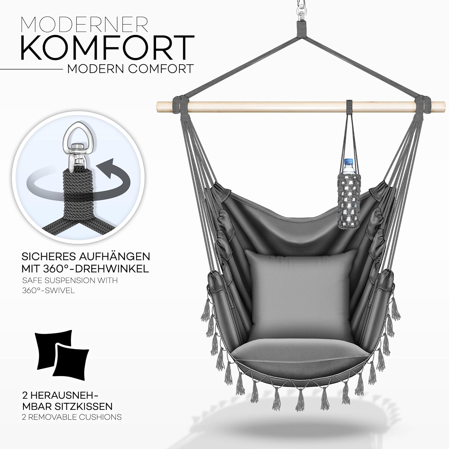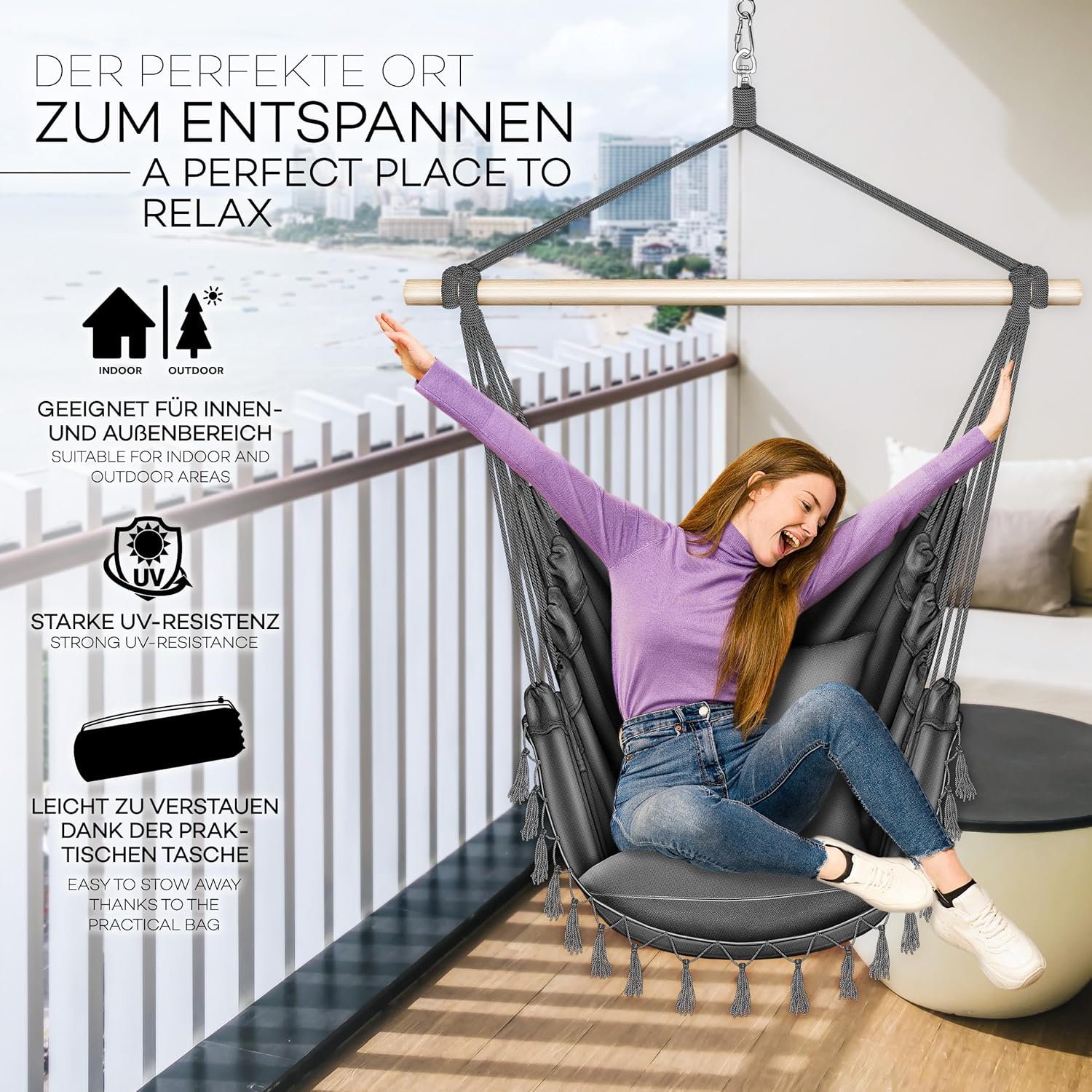 Moeiteloos ontspannen met XXL-kussen: met de moderne en comfortabele tillvex hangstoel kun je ontspannen van een mooie tijd genieten. De 2 dikke en grote XXL-kussens (50 x 50 cm) zijn uitneembaar en passen zich qua kleur aan de hangstoel aan.