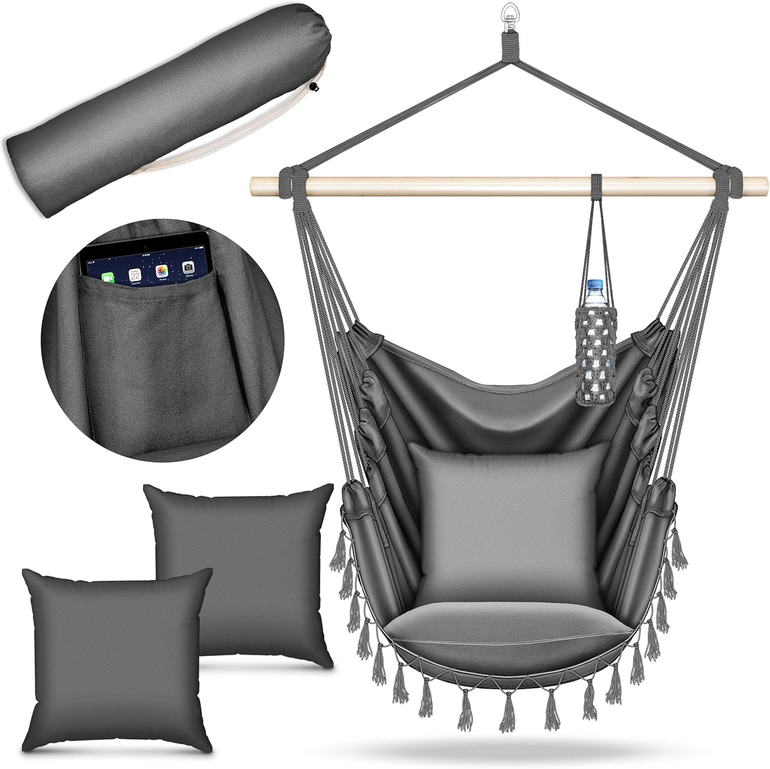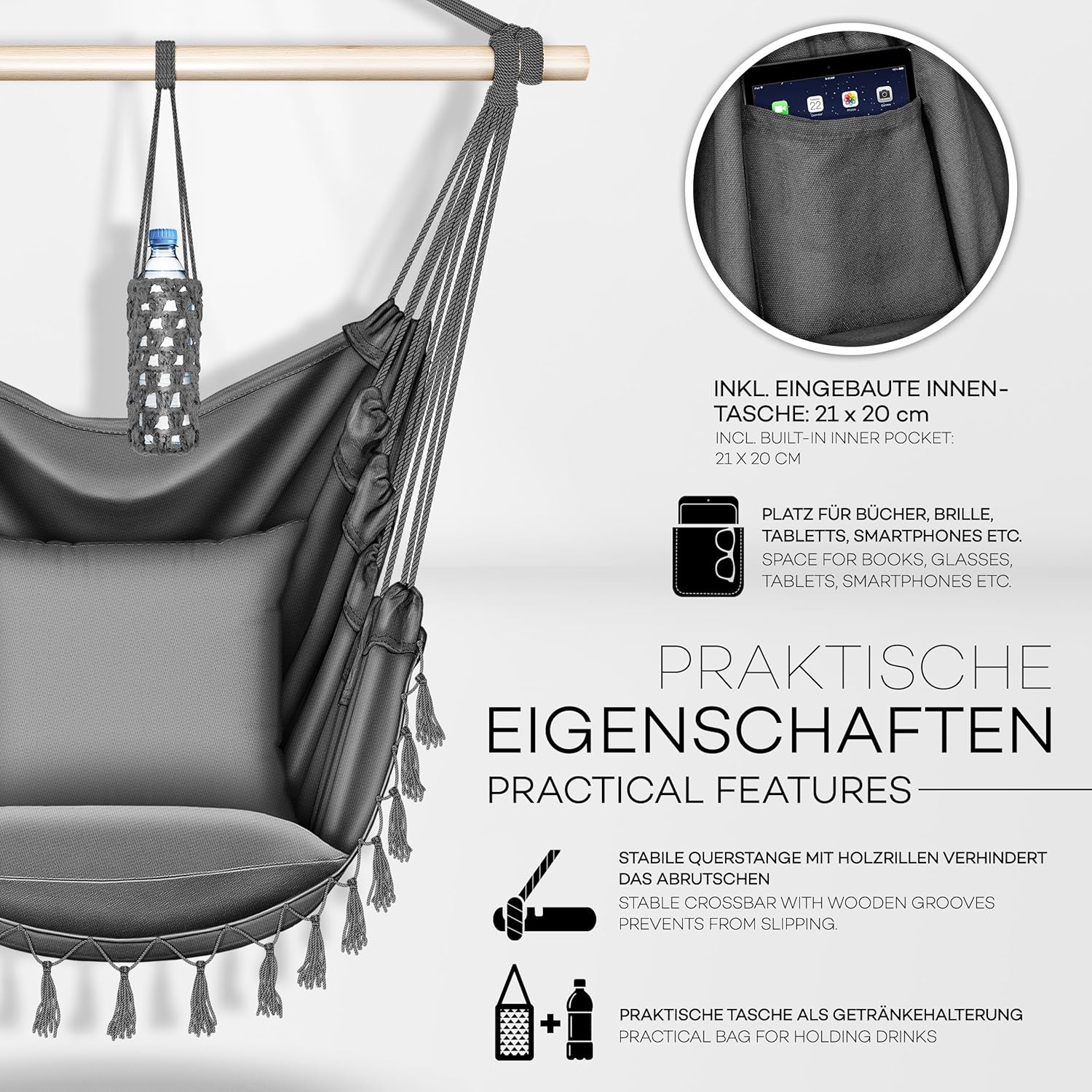 Veel accessoires: de hangstoel heeft een groot binnenvak, voor een boek, mobiele telefoon of tablet (21 x 20 cm). Bovendien kunnen drinkflessen in de bekerhouder worden bewaard. Na gebruik kan de hangstoel in de draagtas worden bewaard.