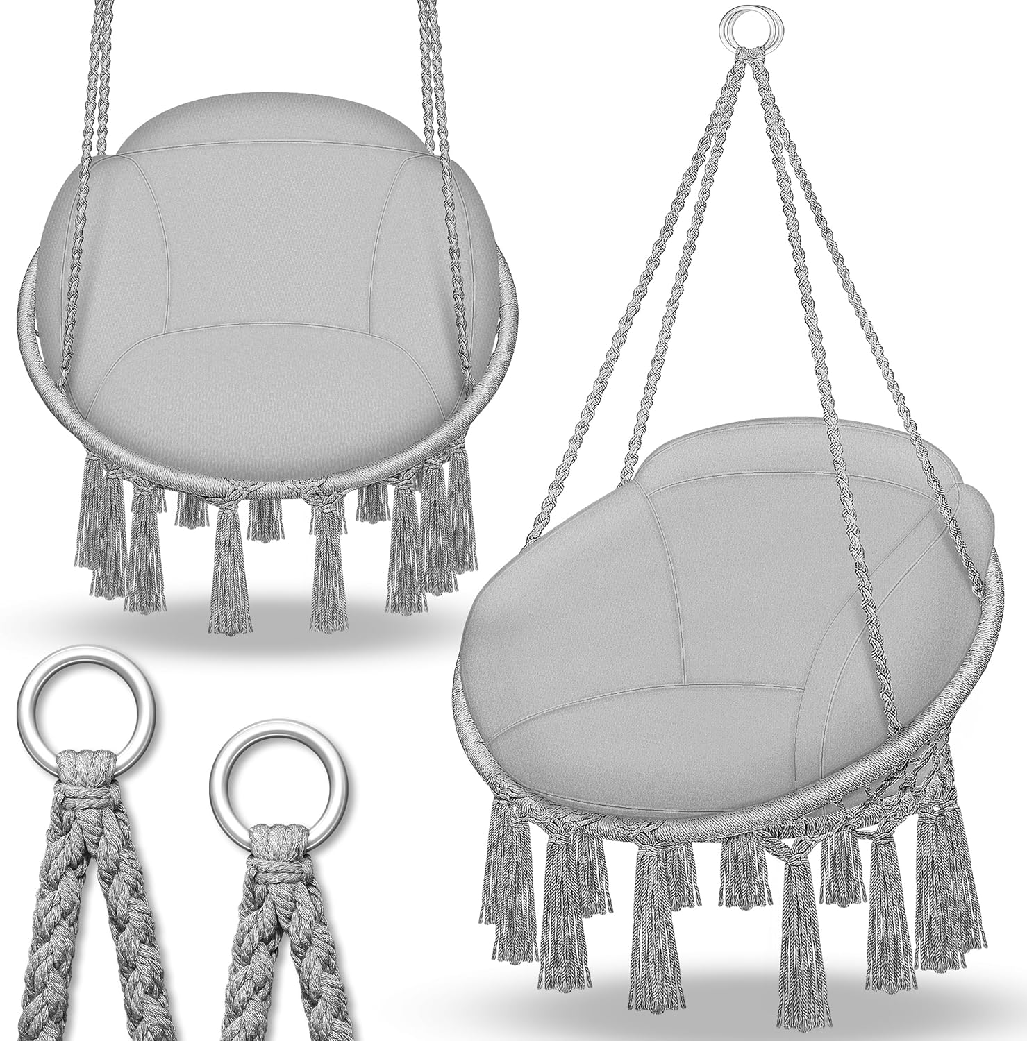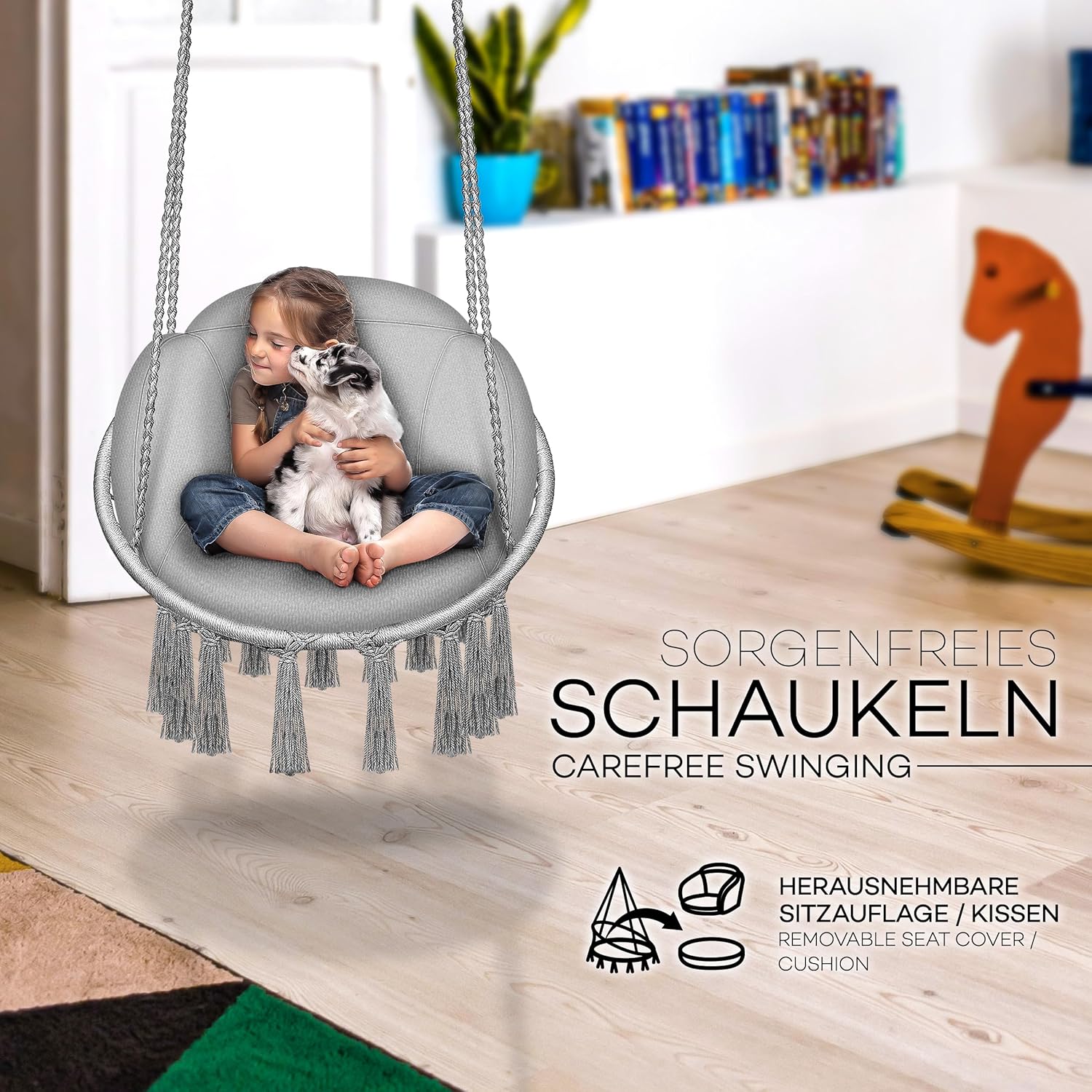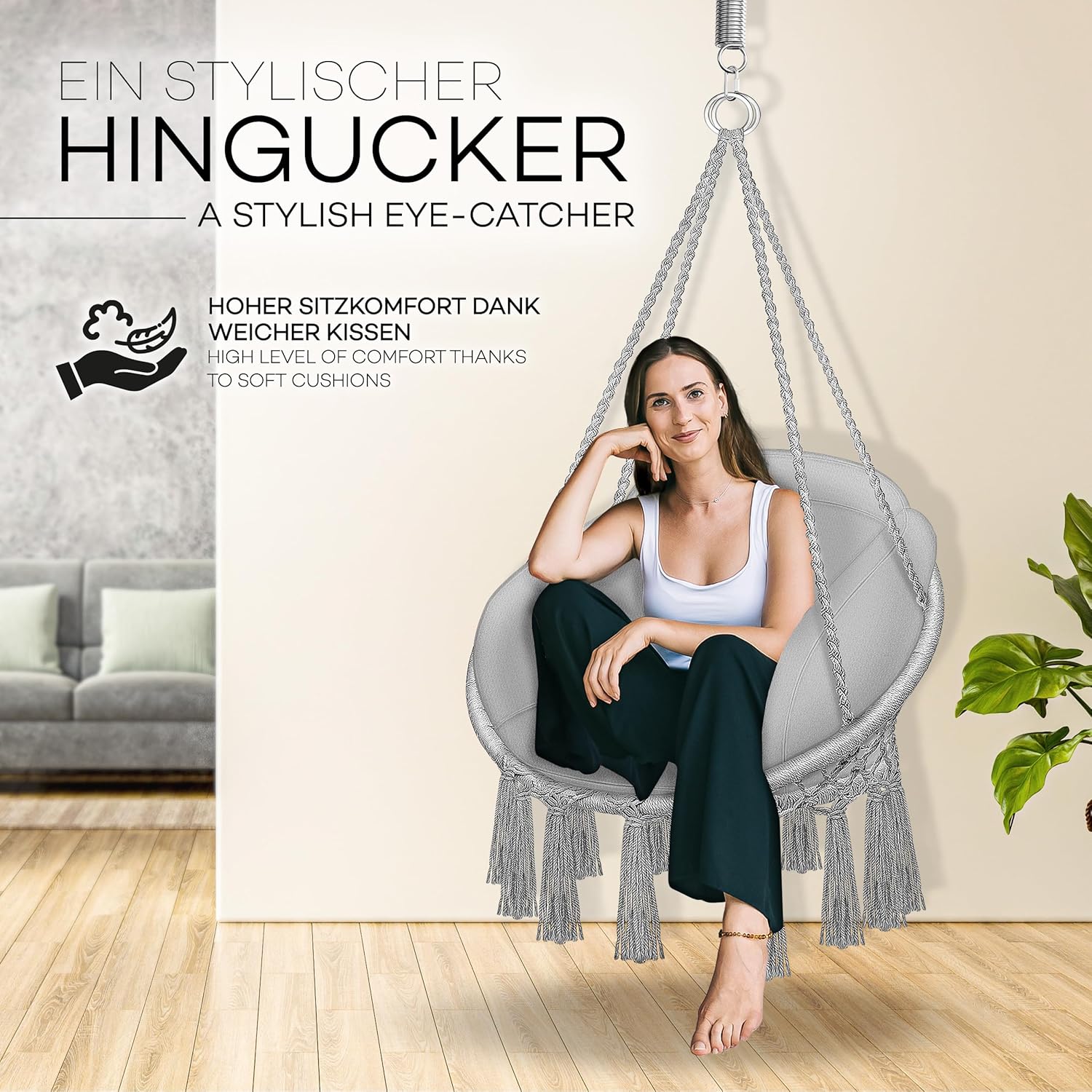 Zacht kussen: het dikke kussen en het fijne katoenen vlechtwerk zorgen bij deze hangstoel voor een ontspannen zitcomfort. De decoratieve sierkwasten zorgen bovendien voor een echte blikvanger.