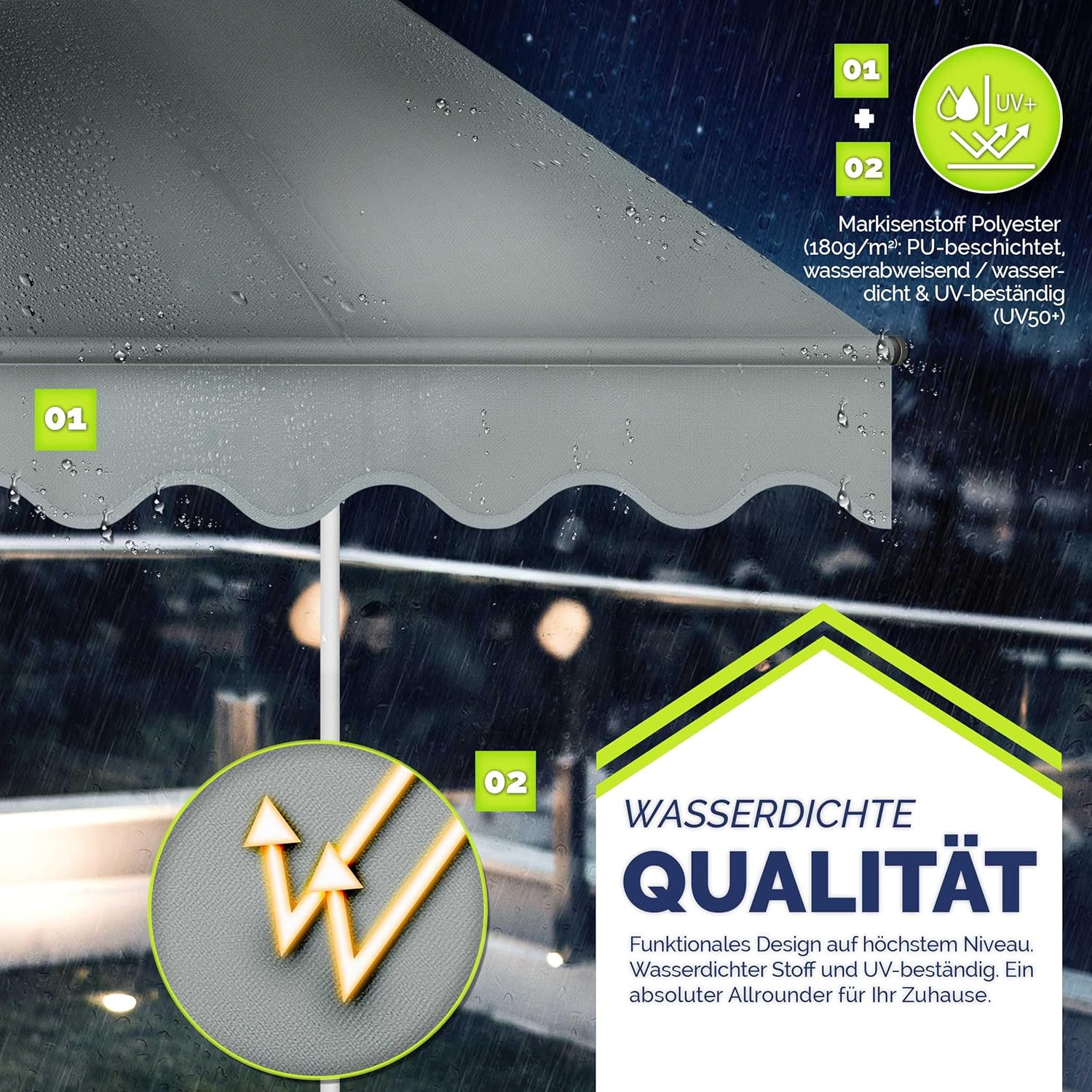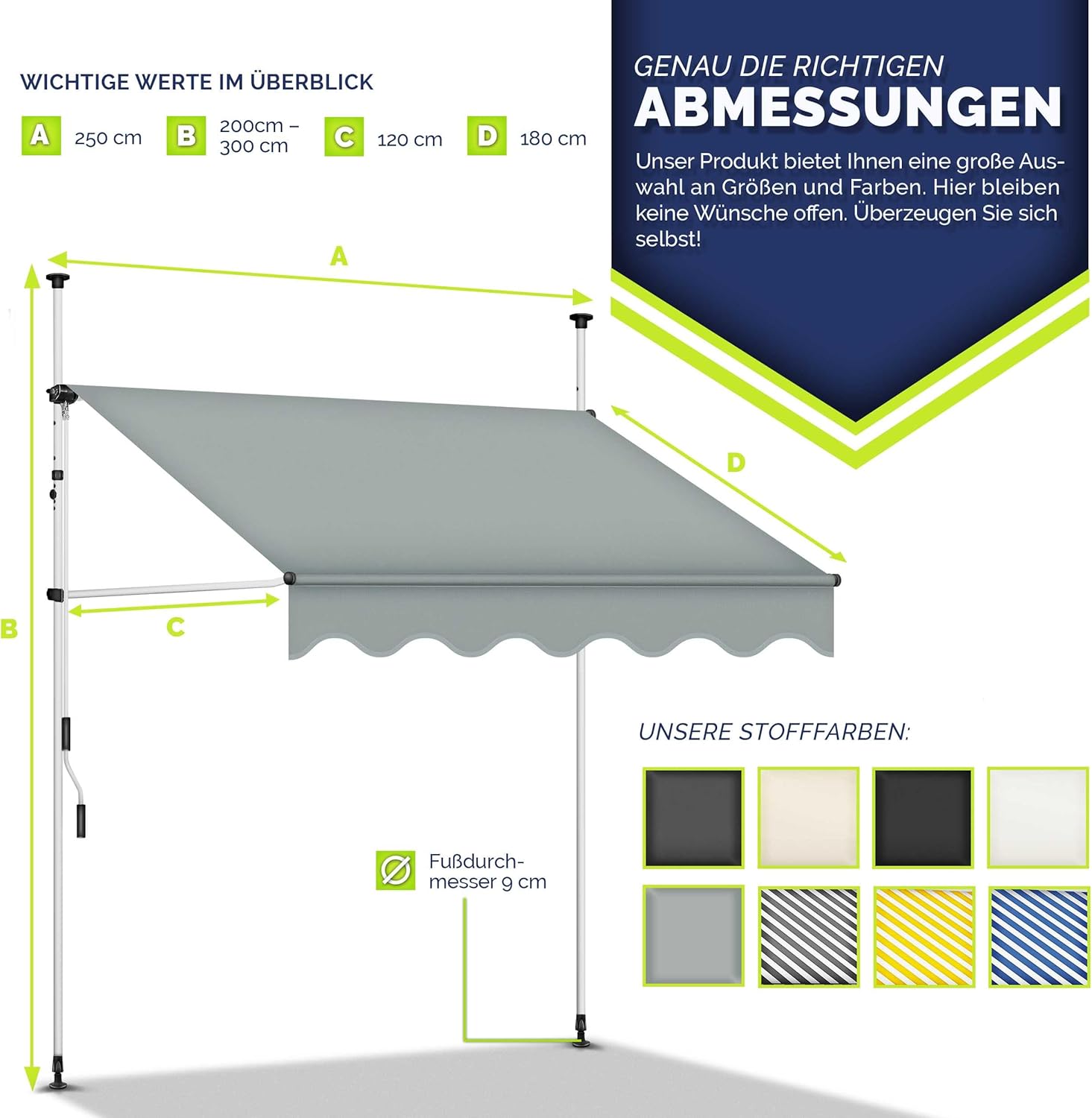 • Voor iedereen de passende hoogte: de meegeleverde zwengel maakt een ideale hoek- en hoogte-instelling (200-300 cm) en een perfecte bescherming tegen de zon mogelijk. Onze terrasluifel kan diagonaal en verticaal worden uitgeschoven. Het volledig oprollen van de luifel maakt bovendien ruimtebesparend opbergen mogelijk.