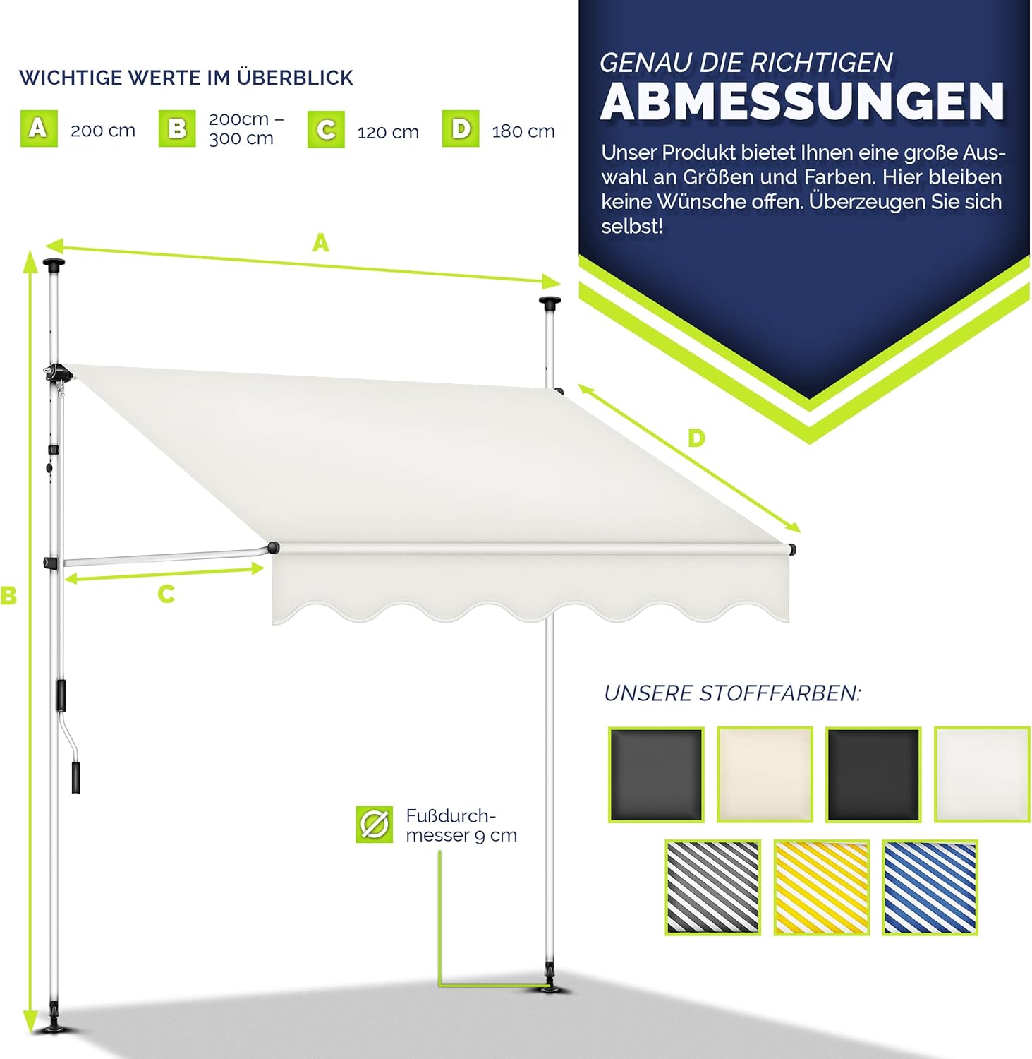 Voor iedereen de passende hoogte: de meegeleverde zwengel maakt een ideale hoek- en hoogte-instelling (200-300 cm) en een perfecte bescherming tegen de zon mogelijk. Onze terrasluifel kan diagonaal en verticaal worden uitgeschoven. Het volledig oprollen van de luifel maakt bovendien ruimtebesparend opbergen mogelijk.
