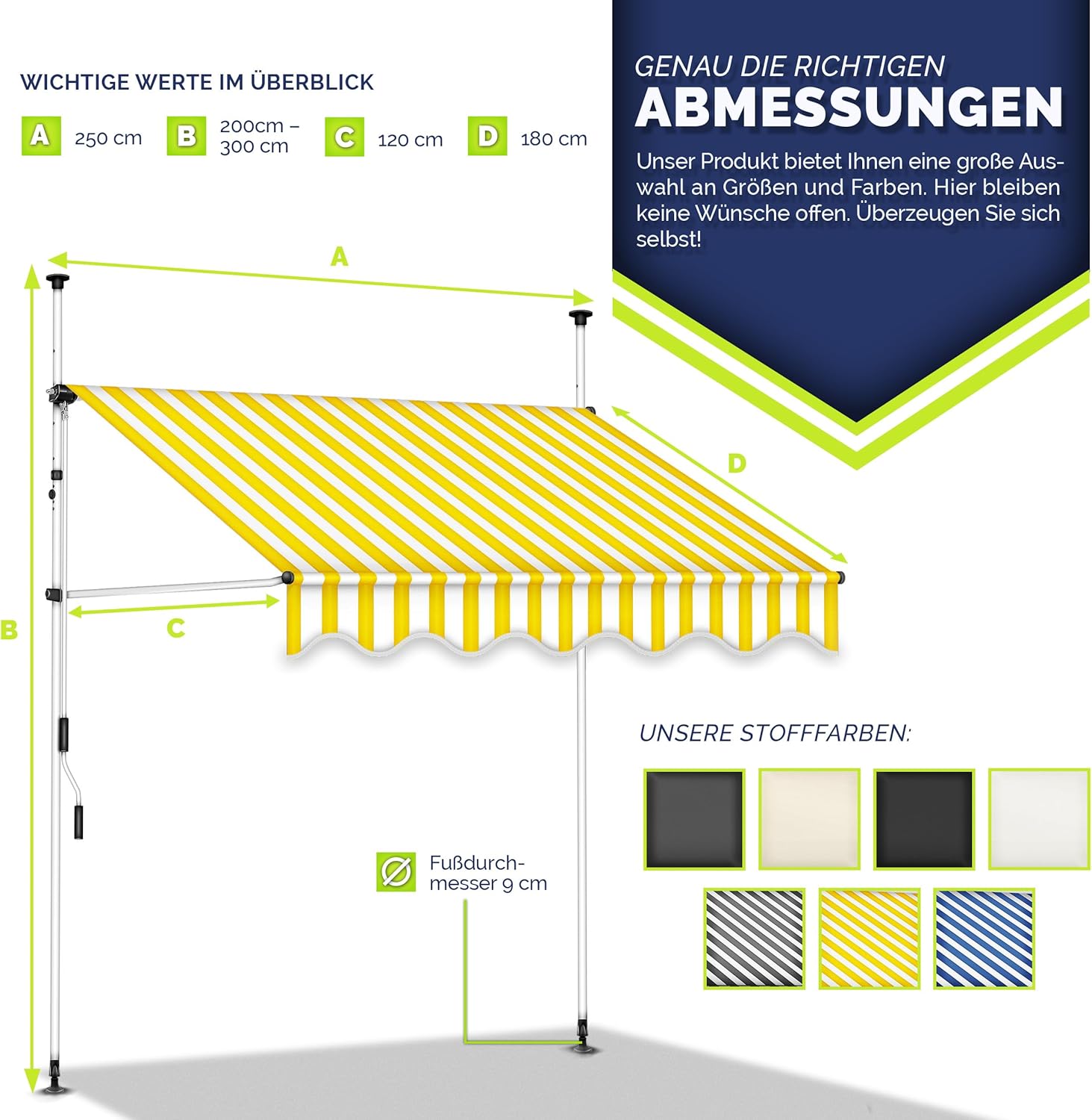 • Voor iedereen de passende hoogte: de meegeleverde zwengel maakt een ideale hoek- en hoogte-instelling (200-300 cm) en een perfecte bescherming tegen de zon mogelijk. Onze terrasluifel kan diagonaal en verticaal worden uitgeschoven. Het volledig oprollen van de luifel maakt bovendien ruimtebesparend opbergen mogelijk.
