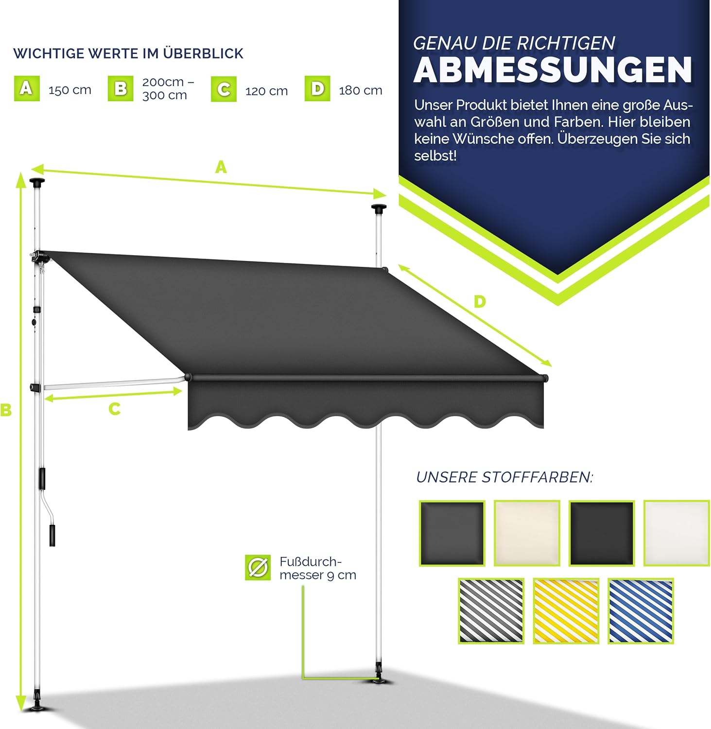 Voor iedereen de passende hoogte: de meegeleverde zwengel maakt een ideale hoek- en hoogte-instelling (200-300 cm) en een perfecte bescherming tegen de zon mogelijk. Onze terrasluifel kan diagonaal en verticaal worden uitgeschoven. Het volledig oprollen van de luifel maakt bovendien ruimtebesparend opbergen mogelijk.