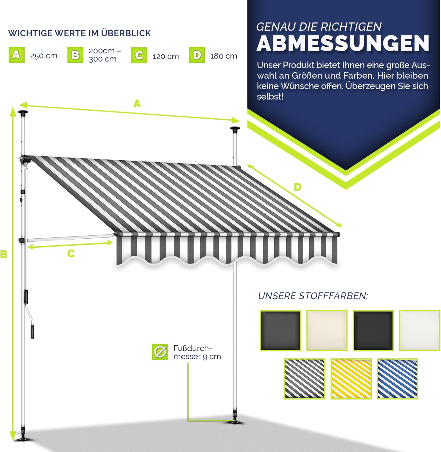 Voor iedereen de passende hoogte: de meegeleverde zwengel maakt een ideale hoek- en hoogte-instelling (200-300 cm) en een perfecte bescherming tegen de zon mogelijk. Onze terrasluifel kan diagonaal en verticaal worden uitgeschoven. Het volledig oprollen van de luifel maakt bovendien ruimtebesparend opbergen mogelijk.