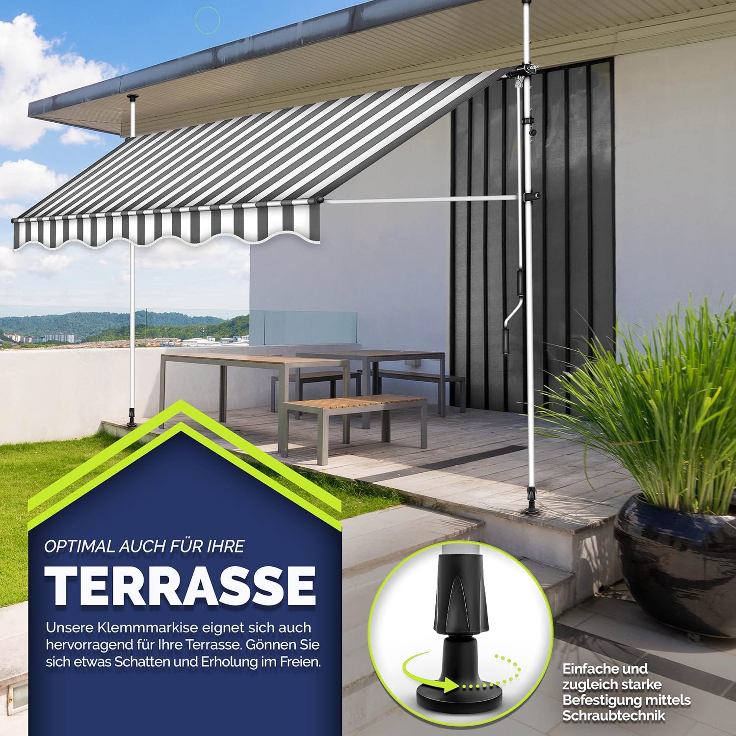 Zon-, warmte-, inkijk- en verblindingsbeschermingDuurzame, weerbestendige en waterafstotende luifelstof, in hoogte verstelbaar, verstelbare hellingshoek, UV-bestendig, eenvoudige montage door klemmechanisme, praktische handslinger