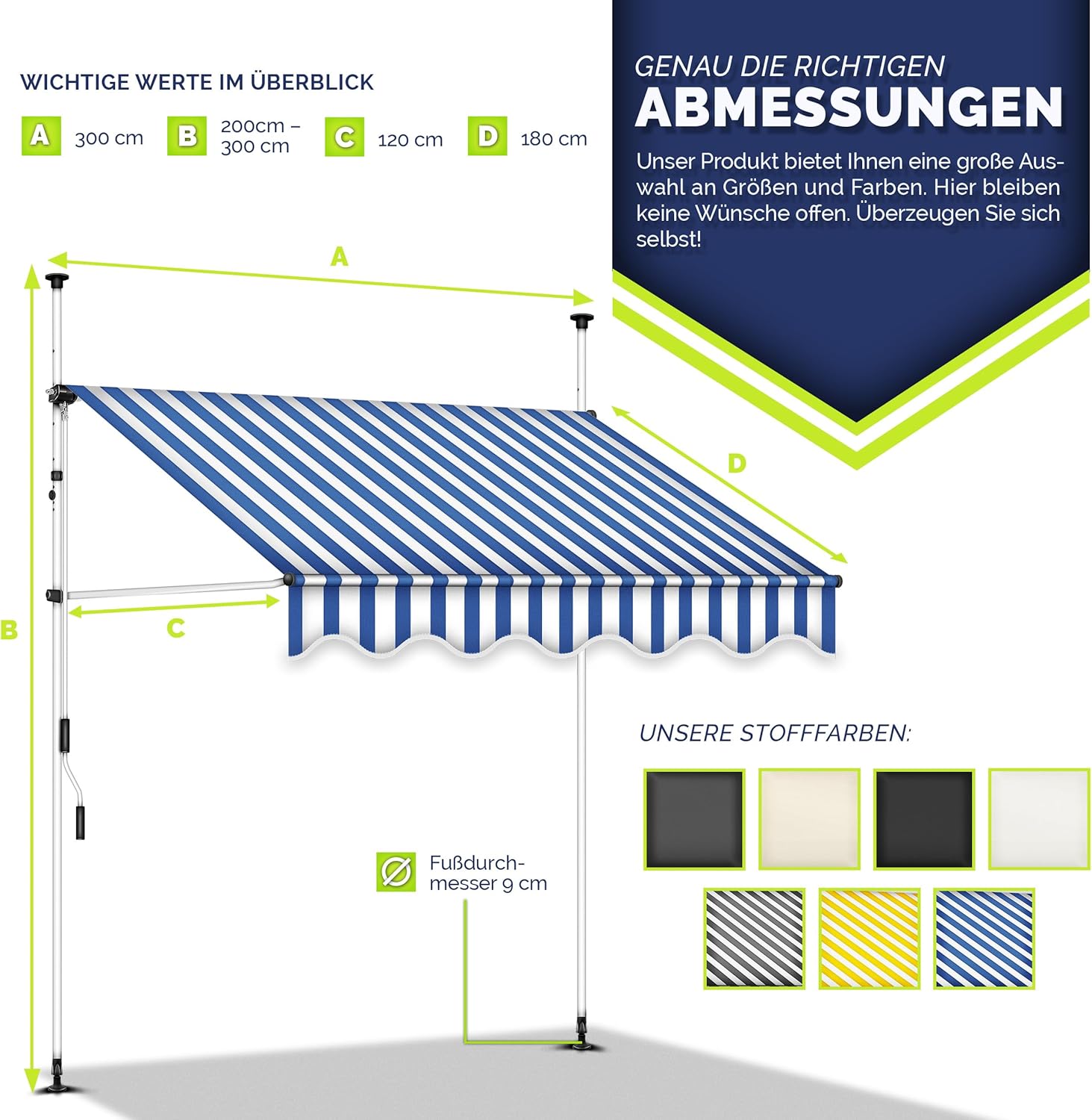 • Voor iedereen de passende hoogte: de meegeleverde zwengel maakt een ideale hoek- en hoogte-instelling (200-300 cm) en een perfecte bescherming tegen de zon mogelijk. Onze terrasluifel kan diagonaal en verticaal worden uitgeschoven. Het volledig oprollen van de luifel maakt bovendien ruimtebesparend opbergen mogelijk.