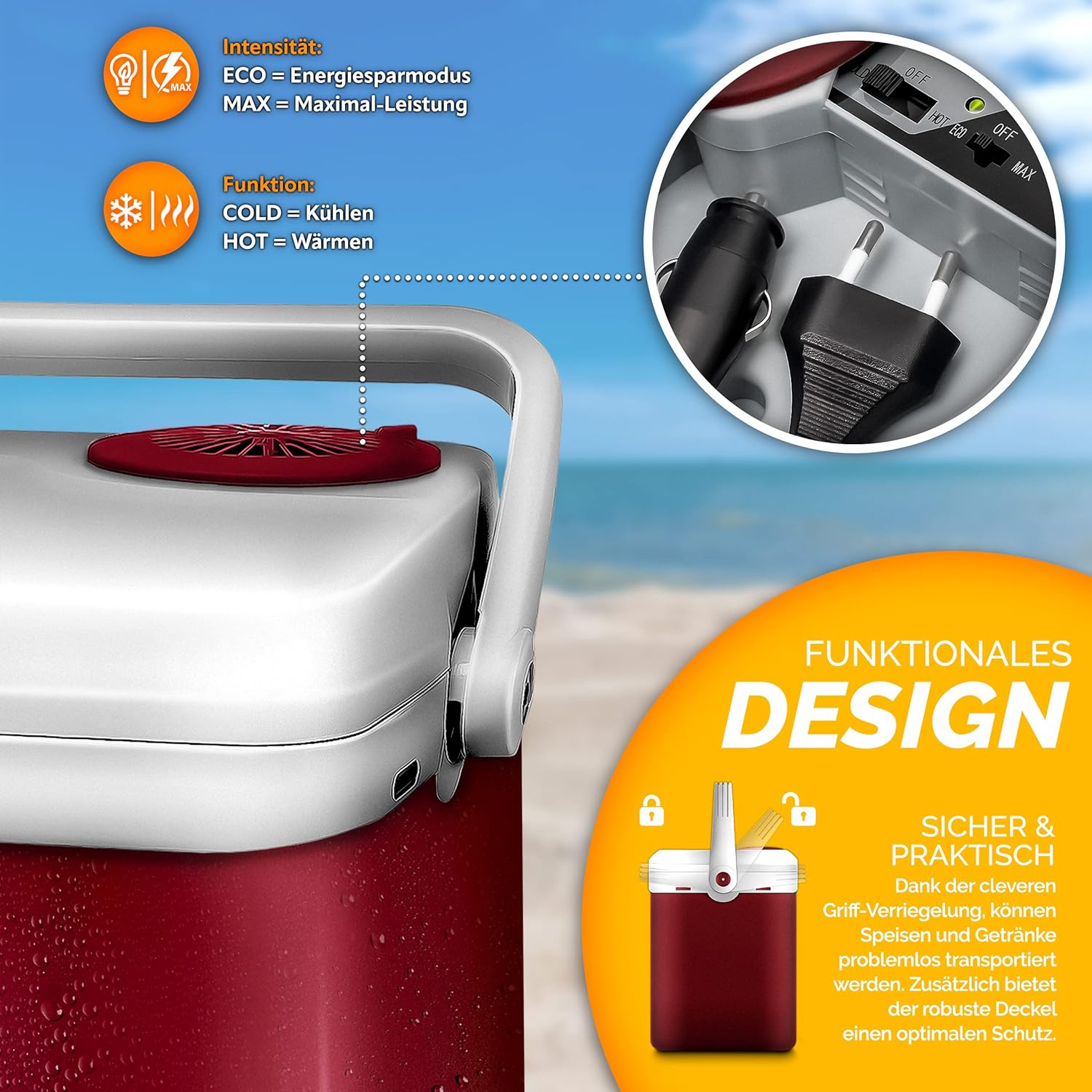 Grote koelbox van 32 liter, koelt en verwarmt 2 standen: Eco & MAX 2 programma's: COLD & HOT Uitneembare roosterinzet led-bedieningseenheid, praktische draagregeling, inclusief 12 en 230 volt stekker voor auto en stopcontact, geïntegreerde AC/DC-transformater, dekselopening in 2 posities mogelijk, dekselvergrendeling, hoogwaardige C5H10 isolatie, kabelopbergvak