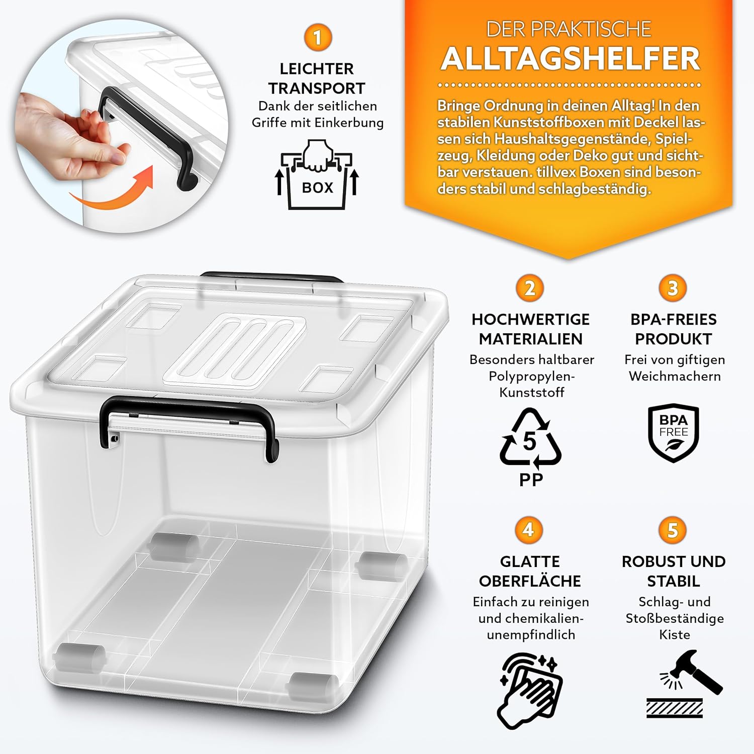 • Plastic dozen voor optimale organisatie: de tillvex kledingdozen zijn de perfecte opbergoplossing. De doorzichtige dozen garanderen een helder zicht op de inhoud. Dankzij hun rolbaarheid, stapelbaarheid en vaste sluitclips bieden ze flexibele toepassingsmogelijkheden. De container en het deksel worden met elkaar vertandd, waardoor bij deze opbergbox een verhoogde stabiliteit wordt gewaarborgd.