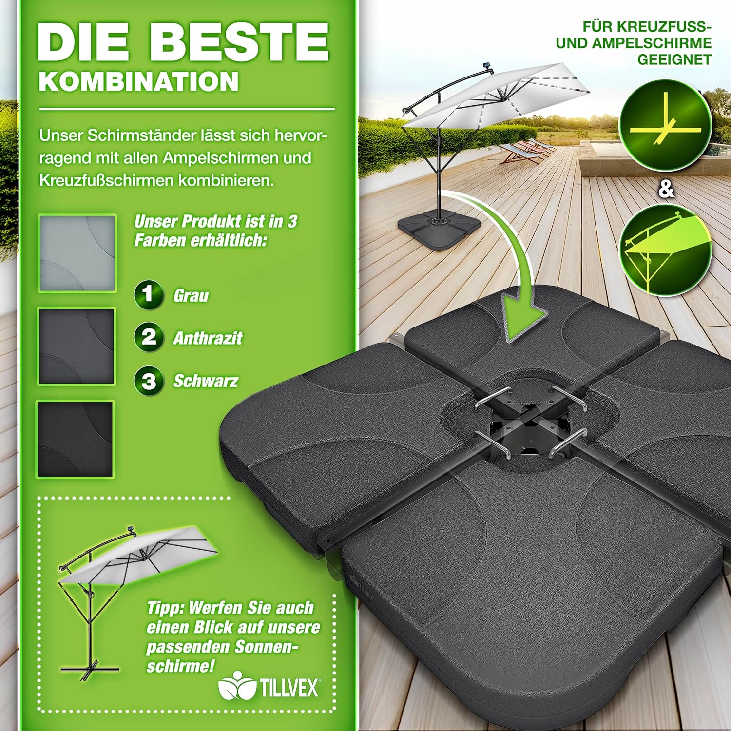 Ideaal voor parasol: geschikt voor alle gangbare zweefparasols met een kruisvoet. De drie elegante kleuren zwart, antraciet en grijs passen perfect bij de meeste buitenmeubels en creëren een harmonieuze sfeer. Kies de juiste kleur en combineer de parasolstandaard met onze veelzijdige zweefparasols van het merk tillvex.