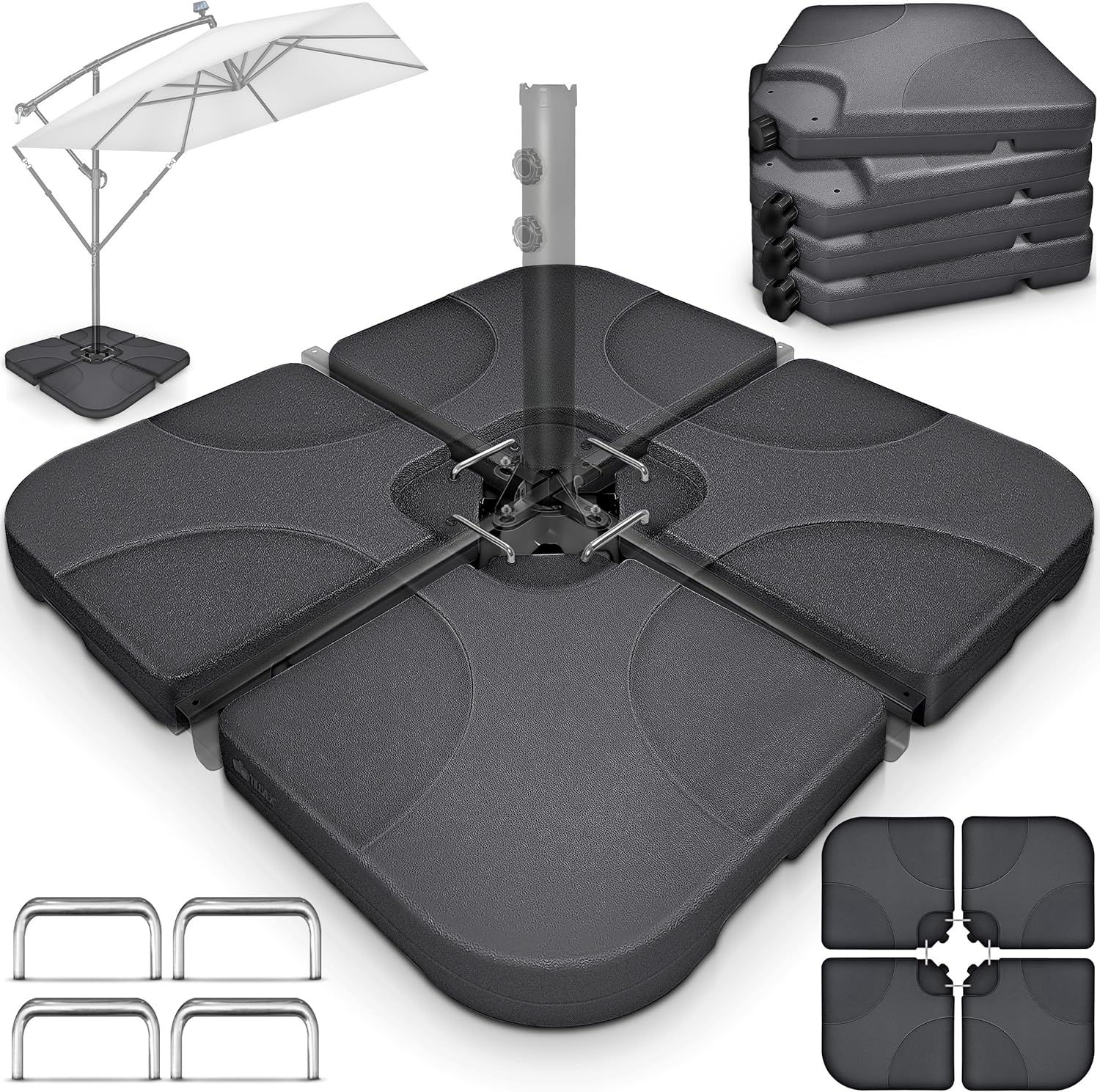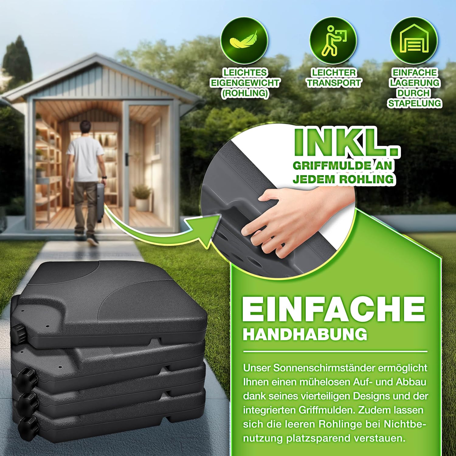 COMPACT ONTWERP: met zijn doordachte, ruimtebesparende ontwerp kan de standaard eenvoudig worden opgeborgen als hij niet in gebruik is. De vier modulaire parasolgewichten kunnen op elkaar worden gestapeld om opbergruimte te minimaliseren. Dankzij de ergonomische handgrepen kunnen de bodemplaten ook bij gevuld gewicht probleemloos naar de gewenste plaats worden verplaatst, perfect voor gebruik op balkon, terras of in de tuin.