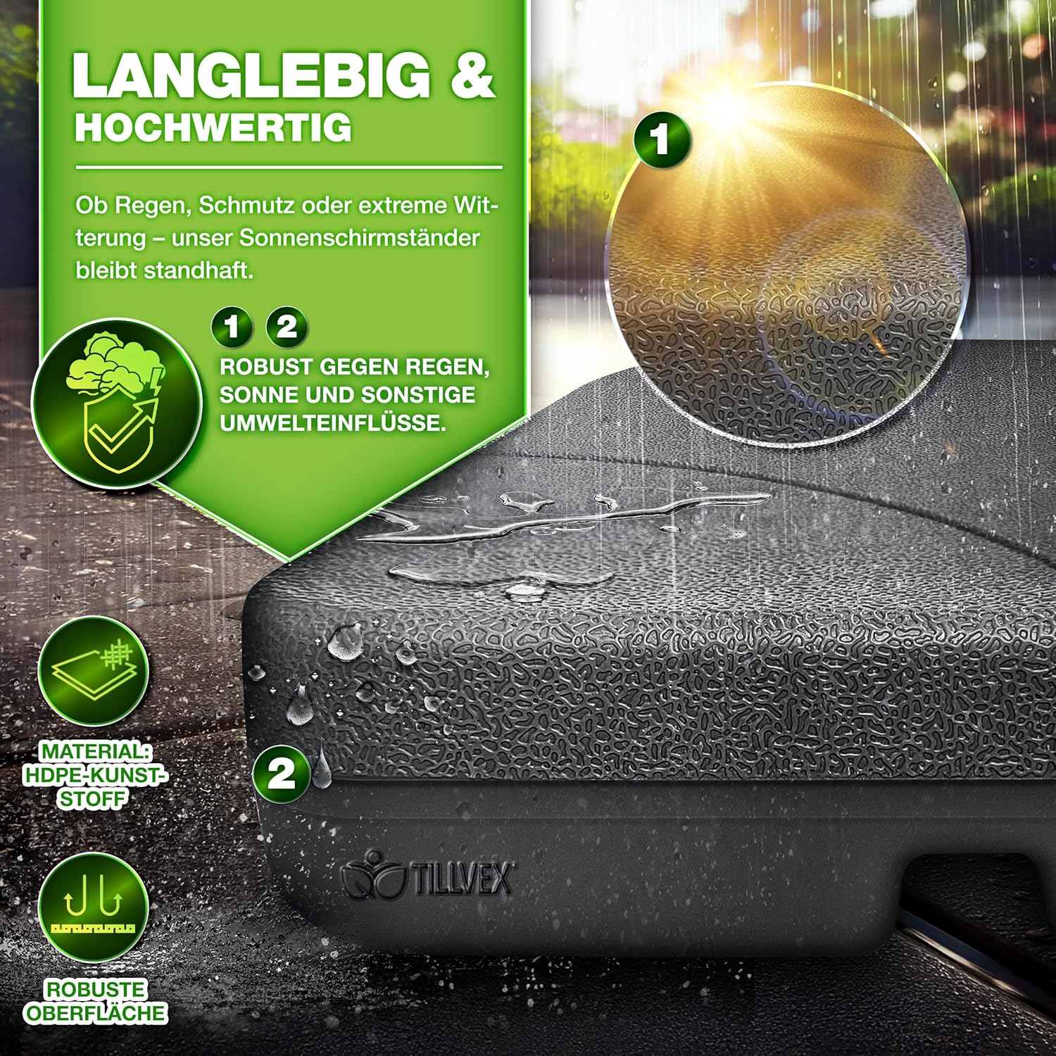 Duurzame kwaliteit: de robuuste HDPE-kunststof van de parasolstandaard is bijzonder goed bestand tegen UV-straling, corrosie en weersinvloeden. Ook bij langdurig zonlicht of regen blijft de sokkel functioneel en behoudt zijn vorm. Door deze hoogwaardige materiaalkeuze is de parasolstandaard bijzonder geschikt voor gebruik buitenshuis het hele jaar door en zorgt hij voor een lange levensduur.