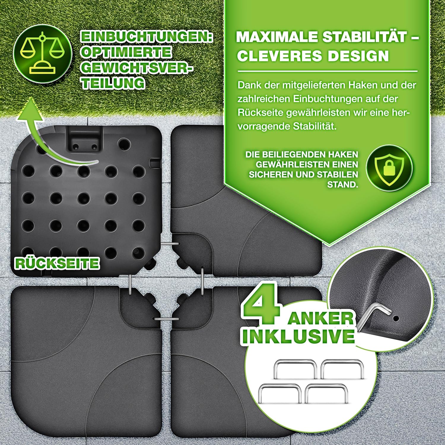 Stabiele grip ook bij wind en weer: dankzij het geoptimaliseerde ontwerp met speciale uitsparingen voor gelijkmatige gewichtsverdeling blijft de parasolvoet ook bij sterke wind stabiel. Extra veiligheid bieden de vier meegeleverde ankers die omvallen voorkomen. Deze balkonparasolstandaard is ideaal voor gebruik in windgevoelige gebieden of op grote terrassen en tuinoppervlakken, waar wind een probleem kan zijn.
