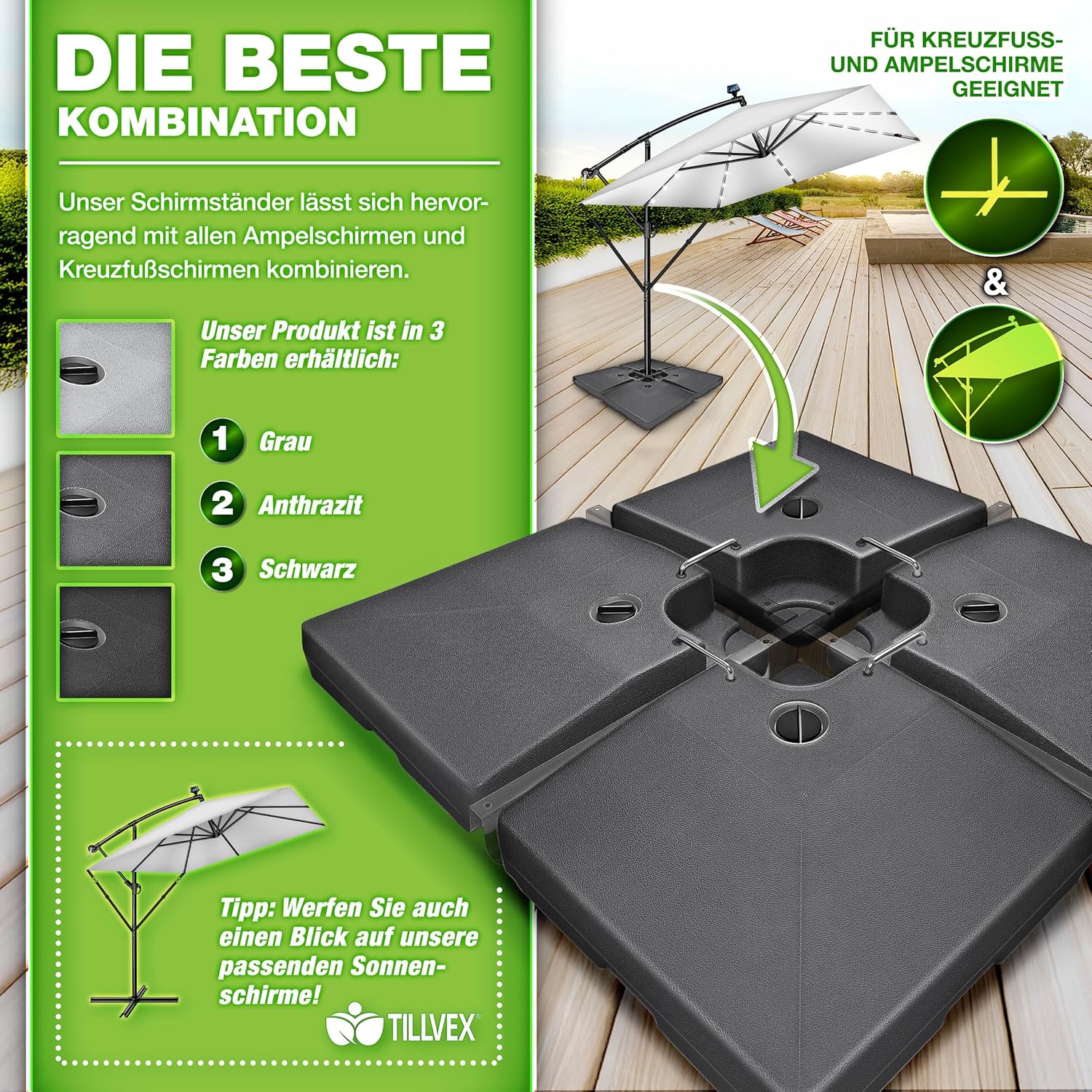 Ideaal voor parasol: geschikt voor alle gangbare zweefparasols met een kruisvoet. De drie elegante kleuren zwart, antraciet en grijs passen perfect bij de meeste buitenmeubels en creëren een harmonieuze sfeer. Kies de juiste kleur en combineer de parasolstandaard met onze veelzijdige zweefparasols van het merk tillvex.